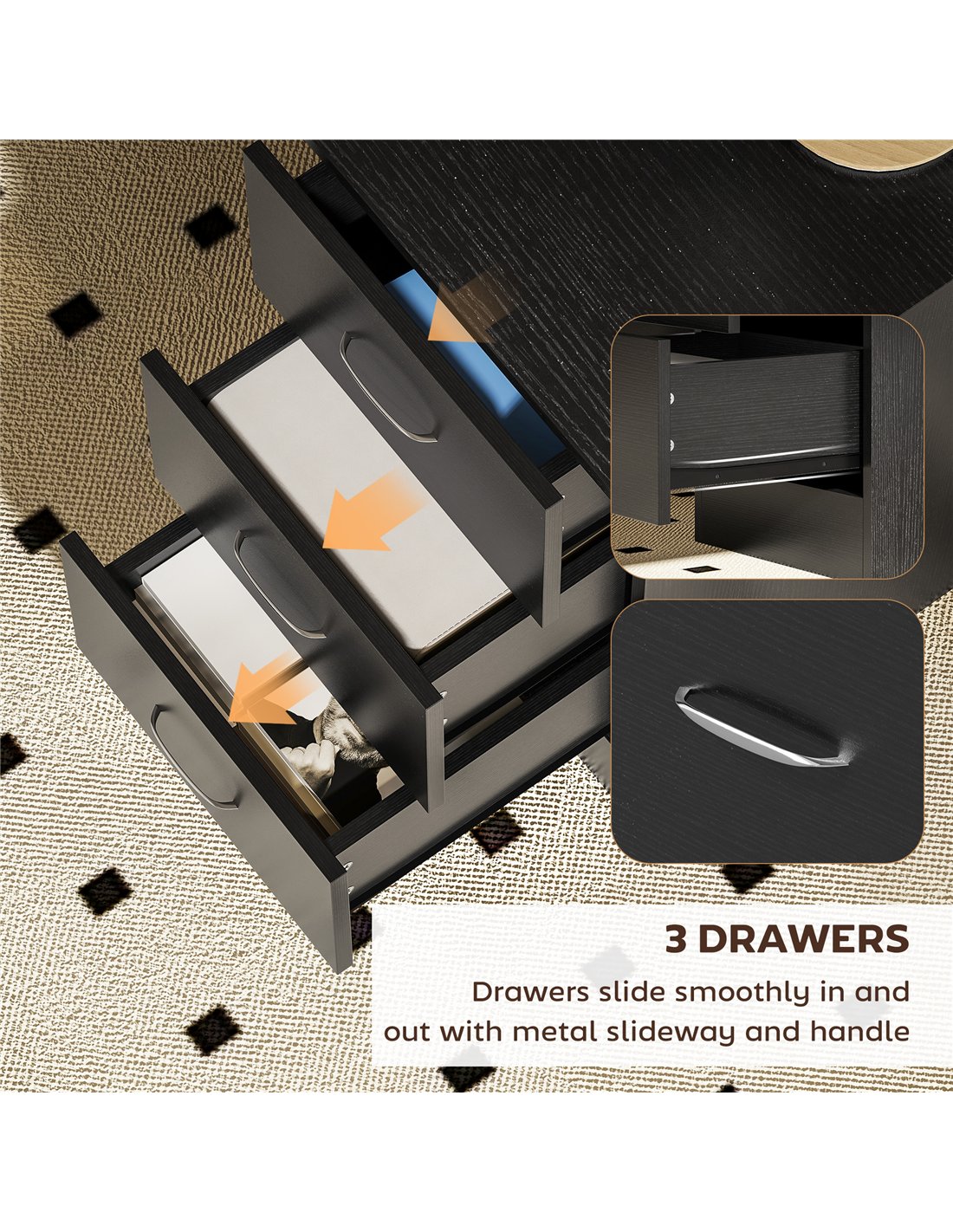 - Handle on each drawer for easy opening and closing