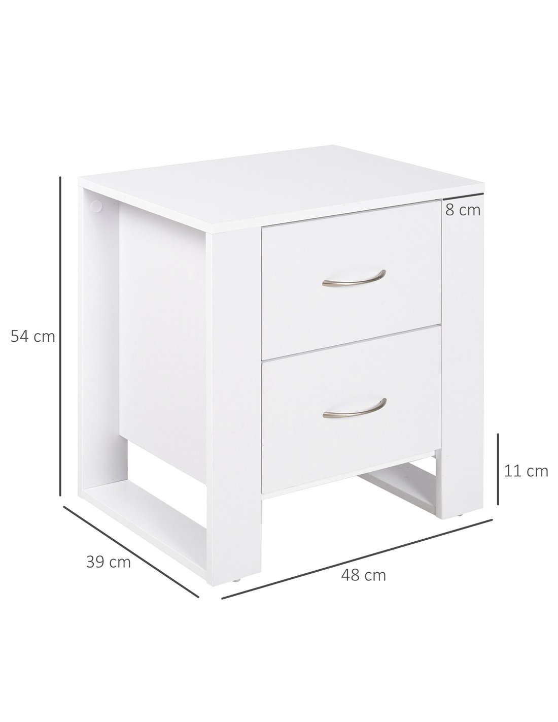 The HOMCOM Bedside Table provides a functional storage solution for your bedroom or living room. This white nightstand presents a modern boxy shape with an elevated base. It includes two smooth-gliding drawers, offering essential space to keep items organised and accessible. Constructed from robust particle board, this table withstands daily use. A protective melamine coating shields the surface from minor marks and stains. The stable leg design supports the unit, providing balance. This versatile side table complements contemporary UK homes with its practical design and discreet storage. It supports a maximum load of 30kg, with each drawer holding 5kg. Assembly is necessary. The table measures 54cm high, 48cm wide, and 39cm deep. Its compact size offers ample storage capacity for your essentials.