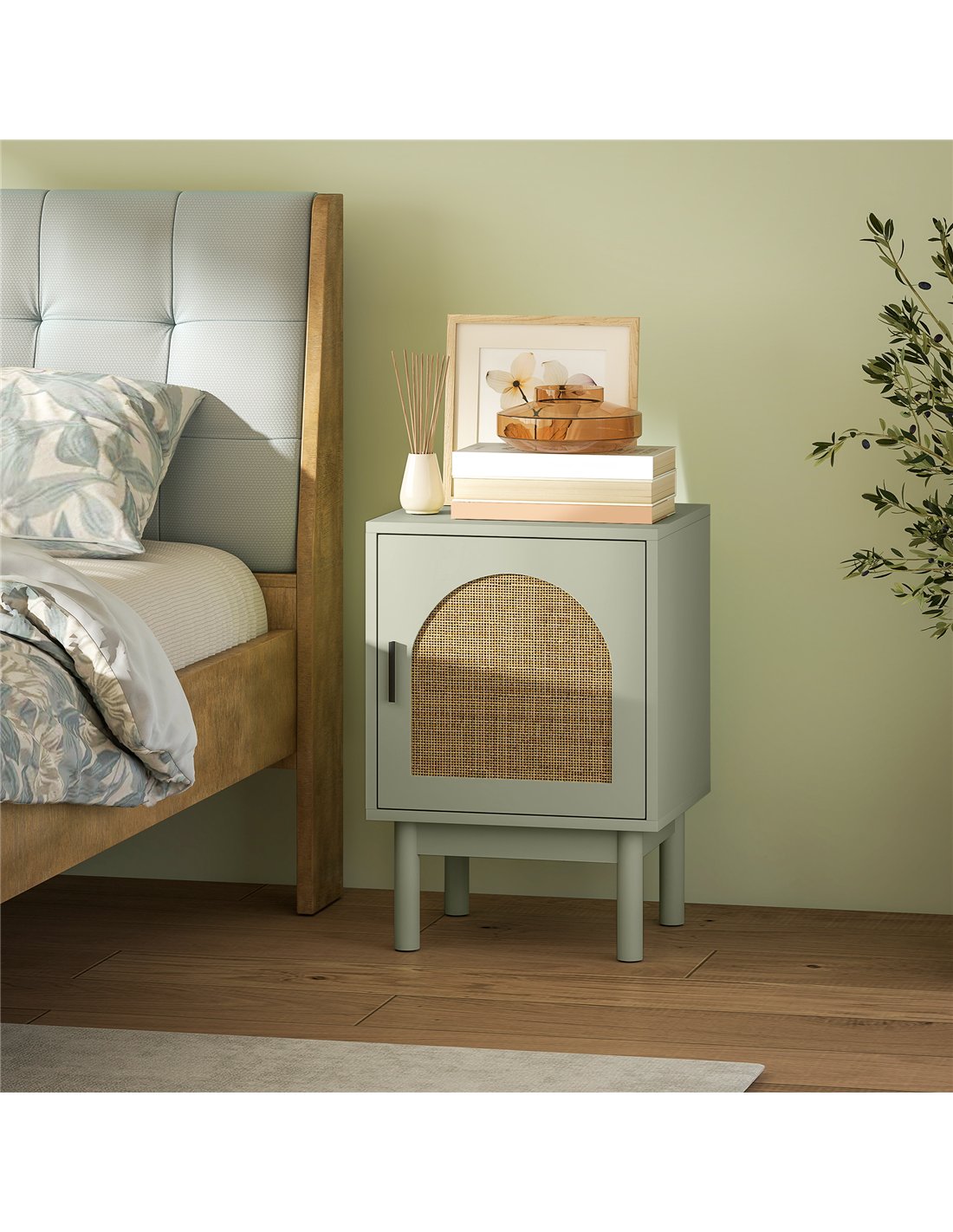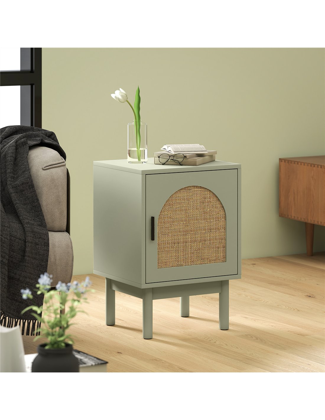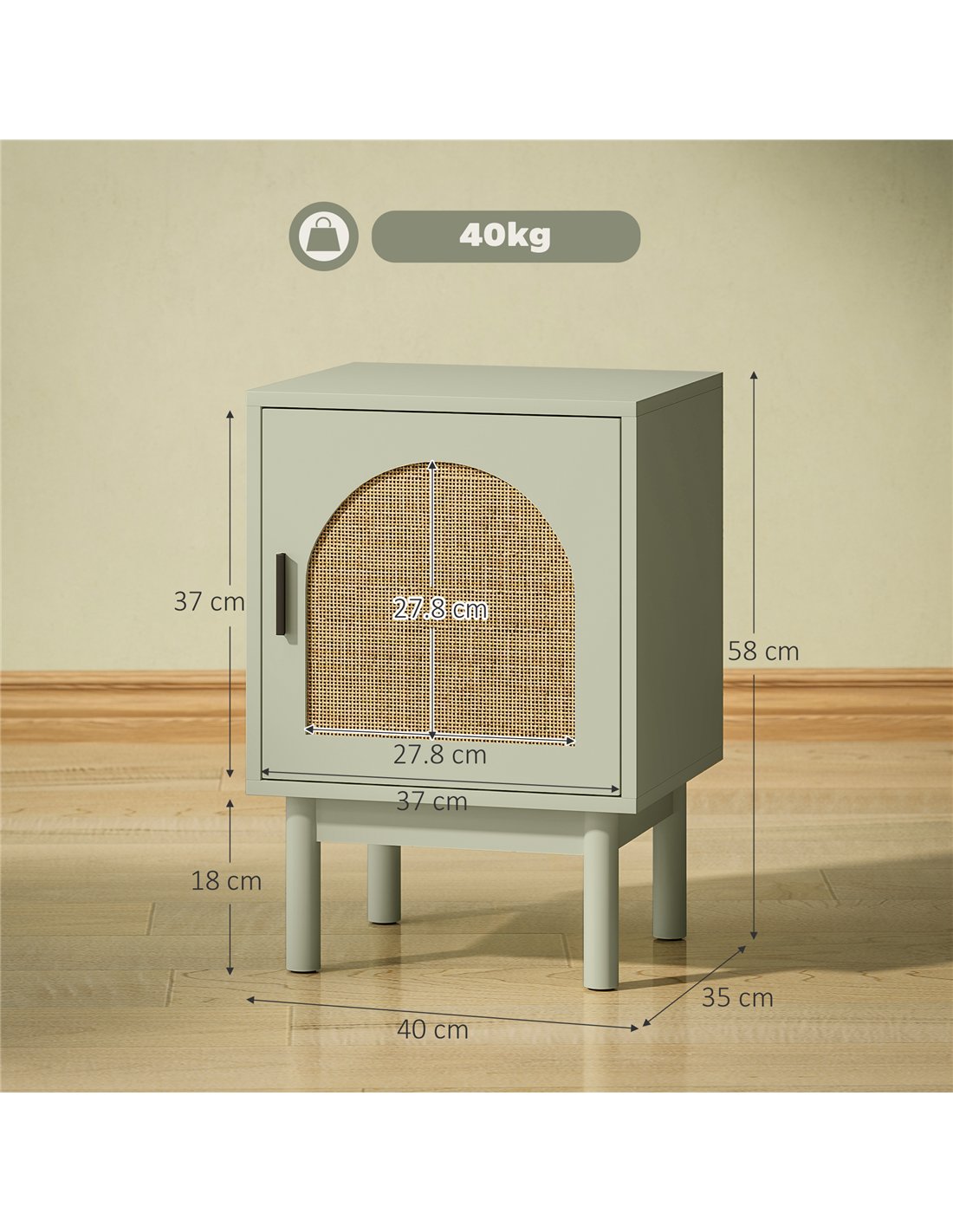 Elevate your bedroom decor with the HOMCOM Rattan Bedside Table, presented in a soothing light green finish. This piece brings a distinct contemporary boho aesthetic to your home, featuring an elegant arch rattan door. You gain organised storage through its practical two-tier cabinet design. Inside, a three-level adjustable shelf allows for flexible storage, accommodating various item sizes precisely. The table stands firmly on robust solid wood legs, equipped with non-slip foot pads to protect your floors from marks or scratches. Use this versatile unit as a compact bedside cabinet or a functional end table in any room. Crafted from durable MDF, natural rattan, and solid wood, it supports a total weight capacity of 40 kg. Its overall dimensions are 40W x 35D x 58H cm. This table offers both refined style and essential practicality.
