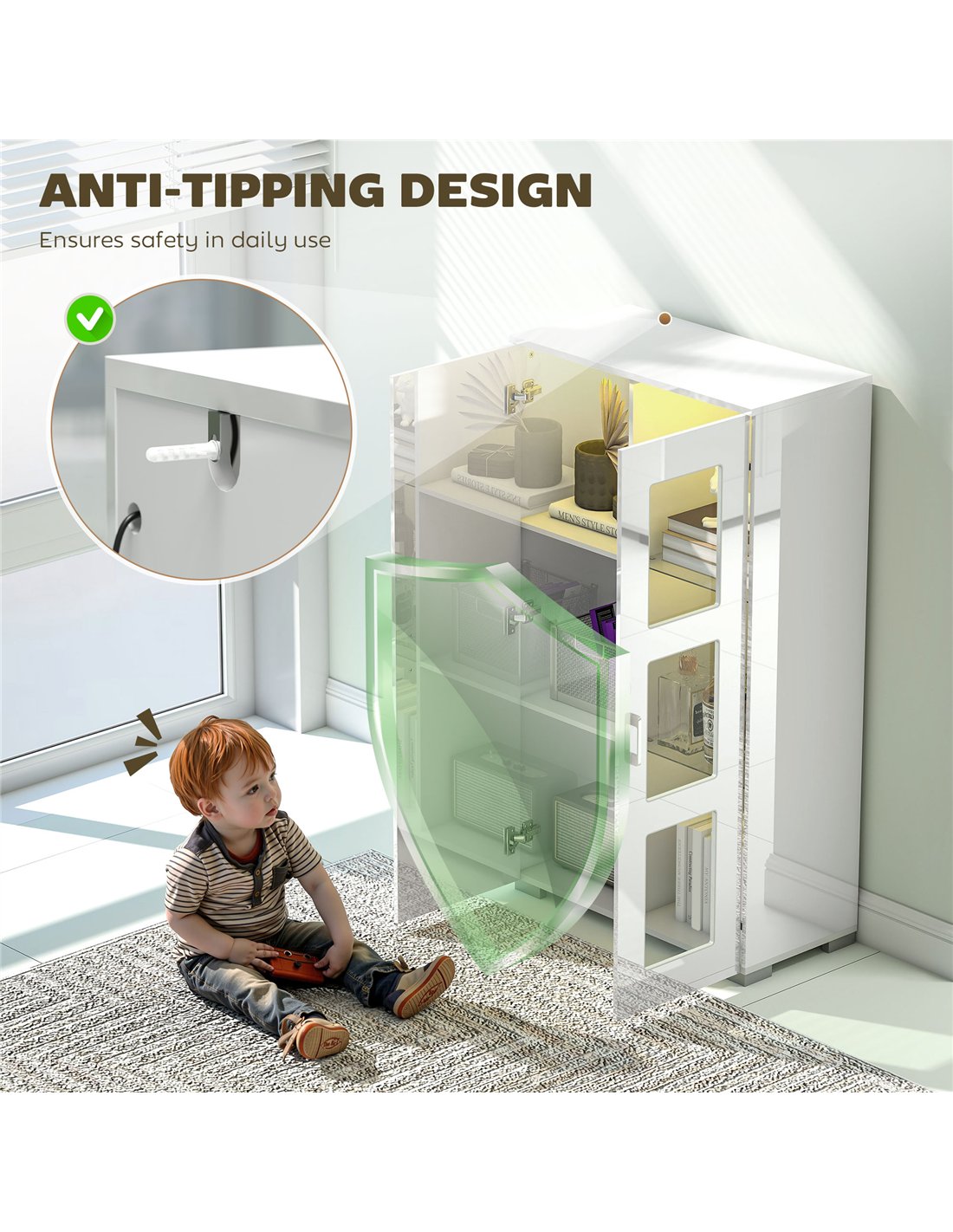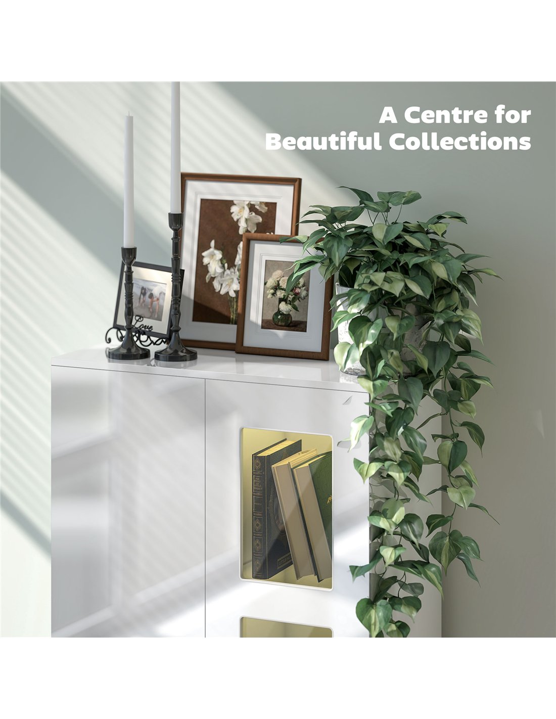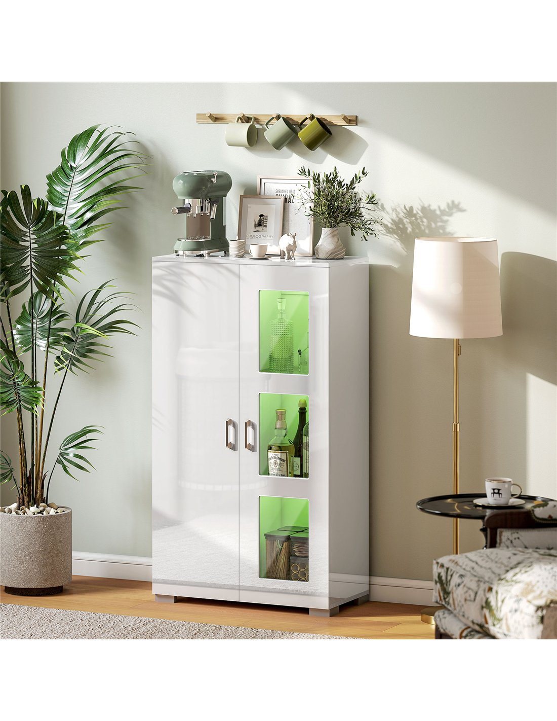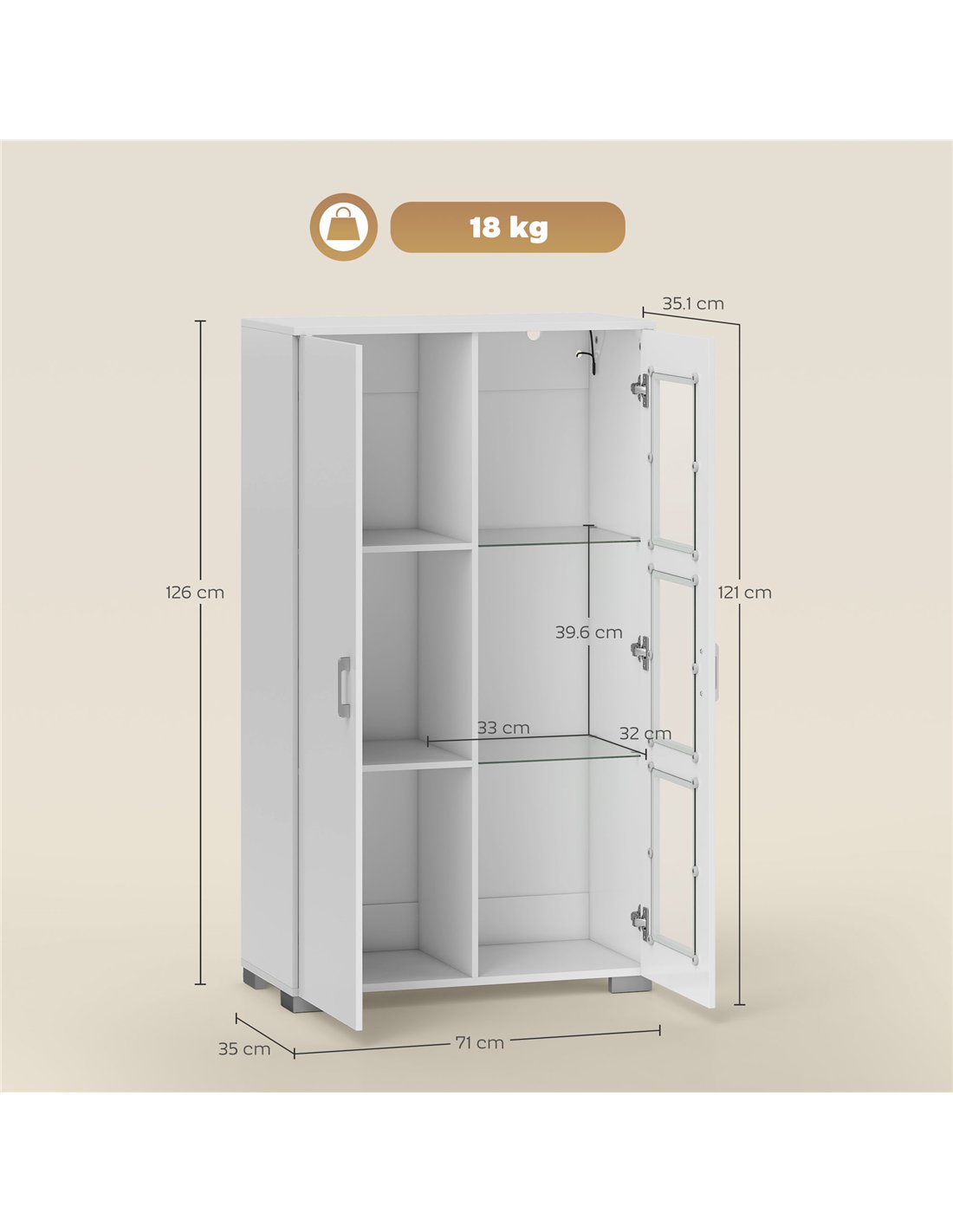 Upgrade your home storage with the HOMCOM High Gloss Sideboard, designed for modern UK interiors. This versatile display cabinet incorporates 16-colour RGB LED lighting, easily managed with a remote control. Set the ideal mood across your living room, dining room, or kitchen spaces. Its sleek white high gloss finish, combined with three transparent glass panels, offers a contemporary aesthetic. The unit functions as a practical storage cupboard, providing tiered organisation for your belongings. Glass doors and internal glass shelves present an elegant display area for items. Maintain a neat and organised environment effortlessly. Constructed from robust, scratch-resistant melamine-faced MDF, this cabinet provides durability and easy cleaning. Soft-close doors ensure quiet use, while adjustable L-shaped feet offer stable placement. An anti-tip kit is supplied for enhanced safety in any household. Assembly is required, delivering a sophisticated storage solution to your home.