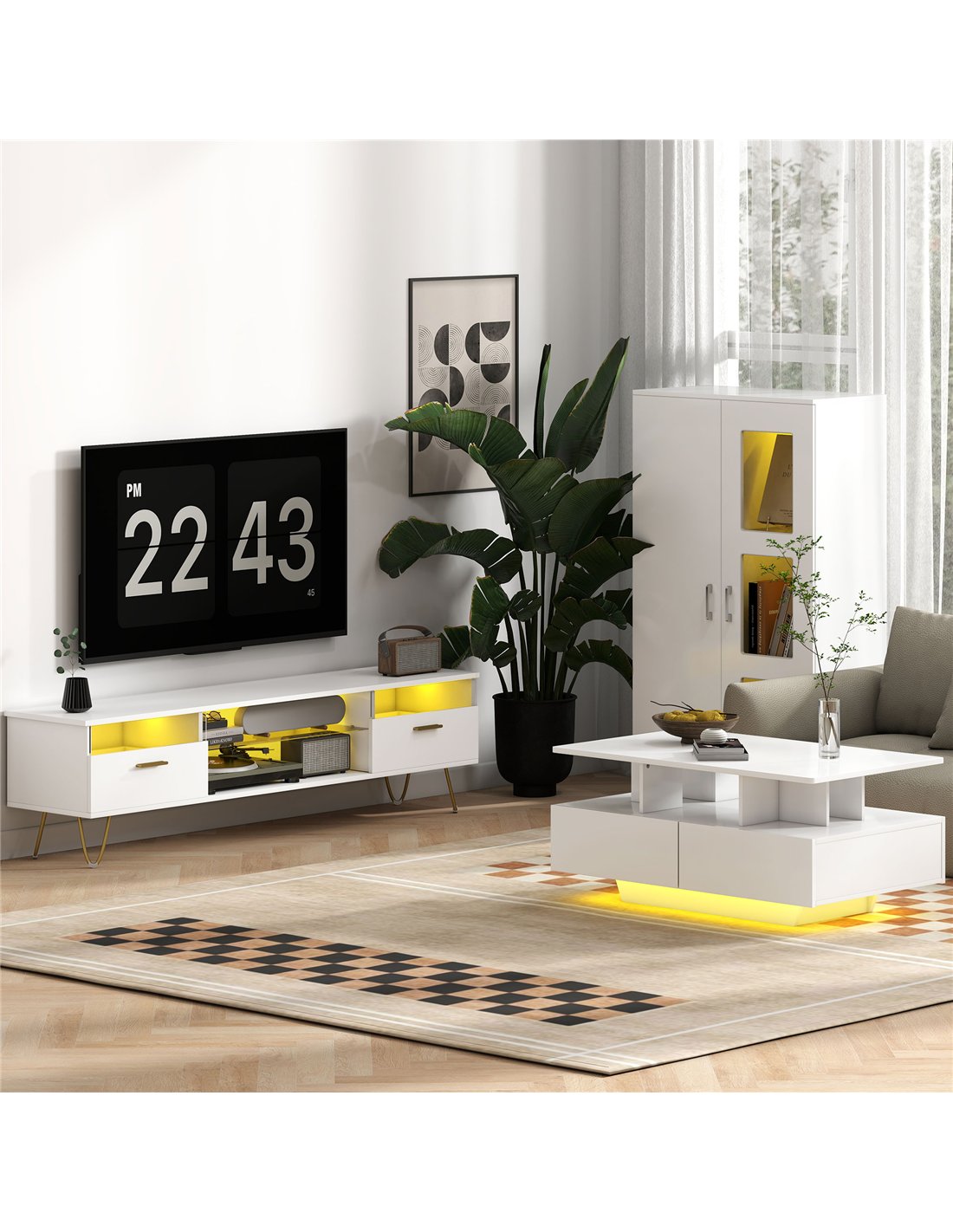 - Modern high-gloss finish and glass doors elevate your living room decor