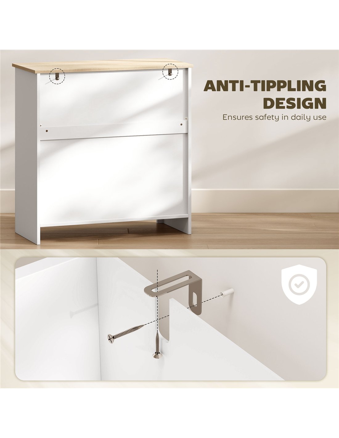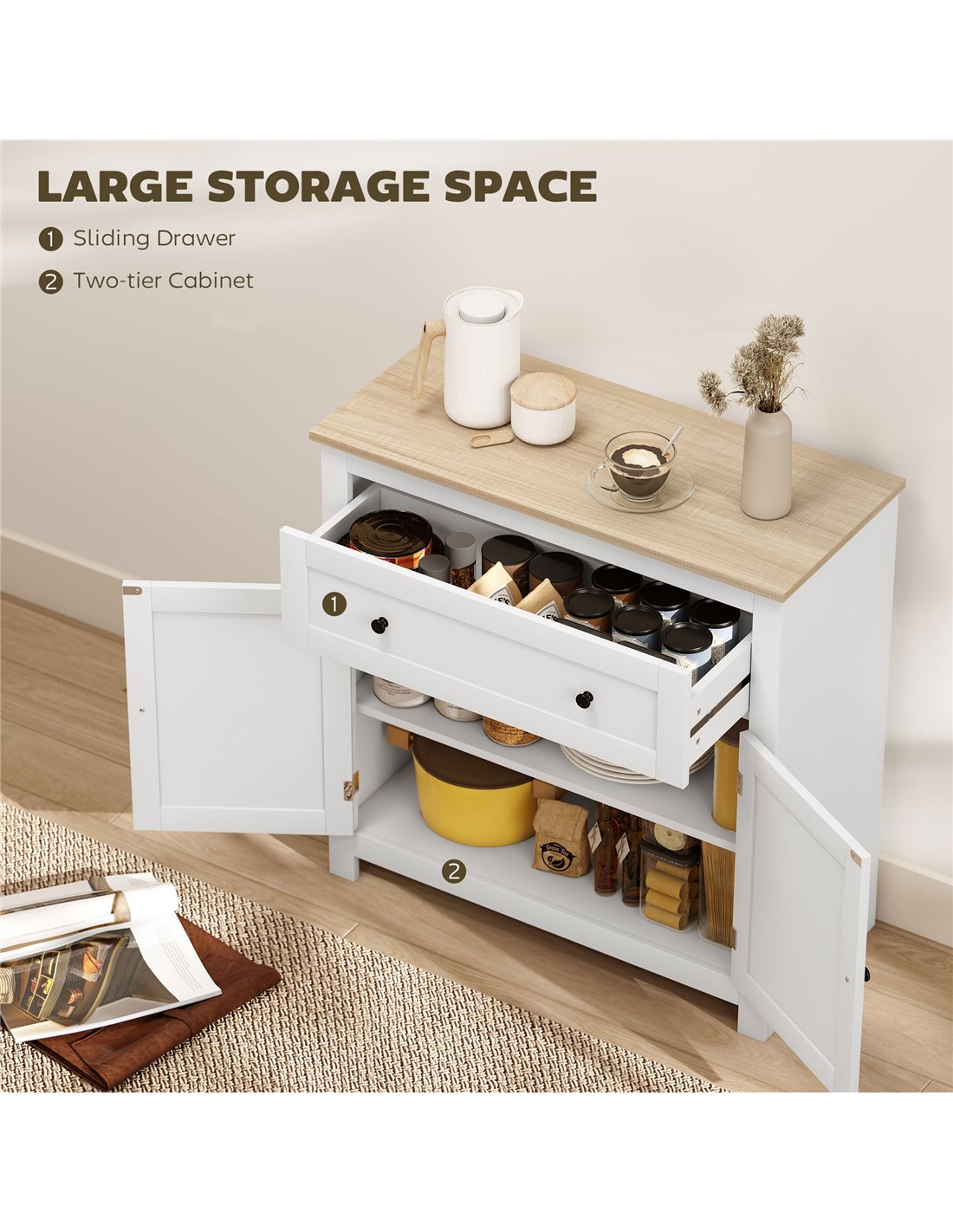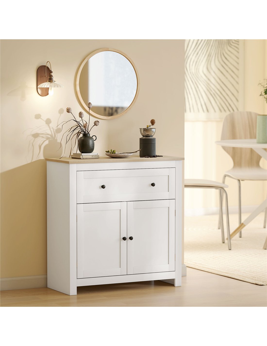 The HOMCOM Sideboard Storage Cabinet delivers practical storage and a sleek, modern aesthetic for homes across the UK. This versatile white kitchen cupboard, designed with a contemporary oak grain top, enhances organisation within living rooms, dining areas, and hallways. It incorporates a large, easy-glide drawer and a double-door cabinet featuring an adjustable shelf, providing adaptable storage for crockery, glassware, or small appliances. Built from robust melamine-faced particleboard, this unit offers lasting durability and effortless cleaning. Its thoughtful design and compact dimensions make it suitable for various room configurations. An anti-tip kit is supplied to ensure secure placement and household safety. This essential furniture piece helps maintain an orderly and stylish home.