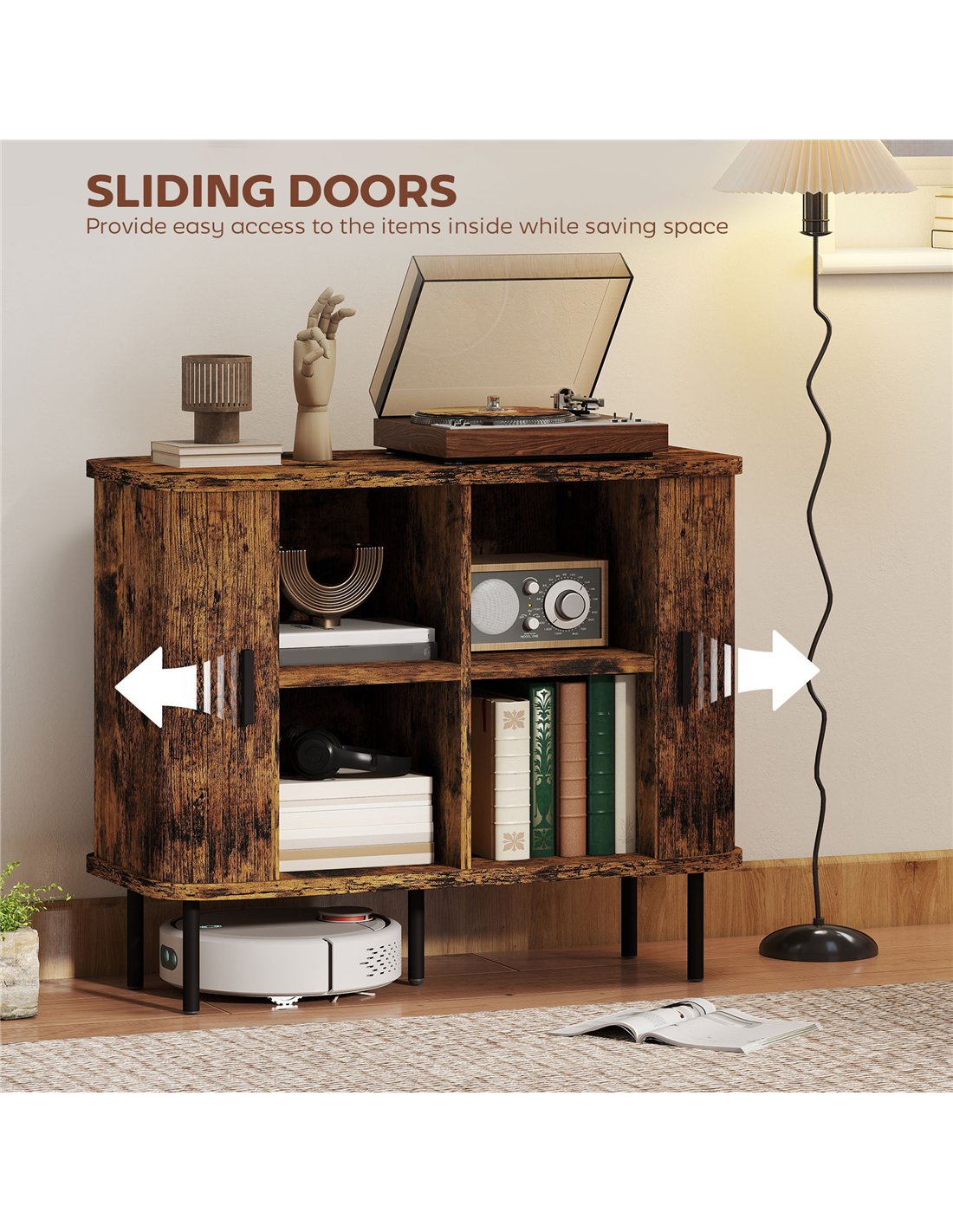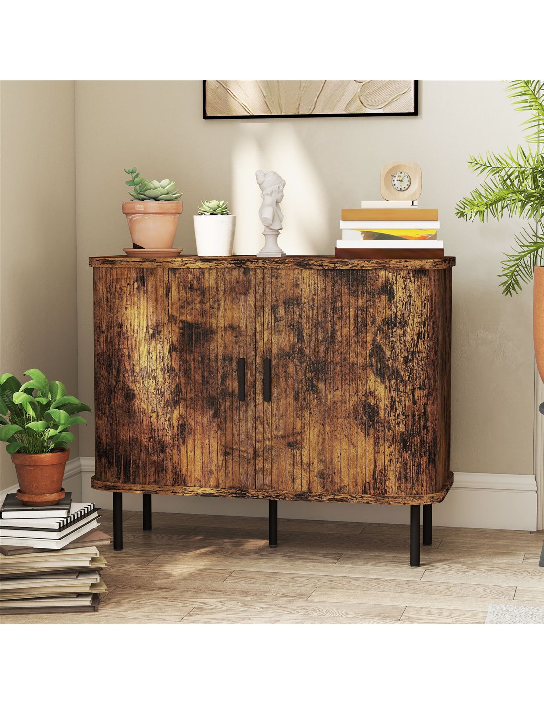 - Mid-Century modern style with slatted tambour doors adds a unique, decorative touch