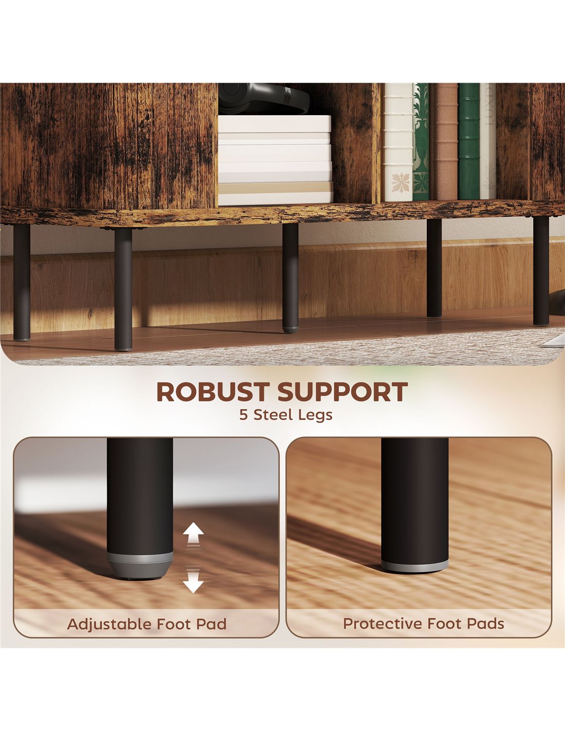 - Four legs with protective foot pads and extra middle legs with adjustable foot pads