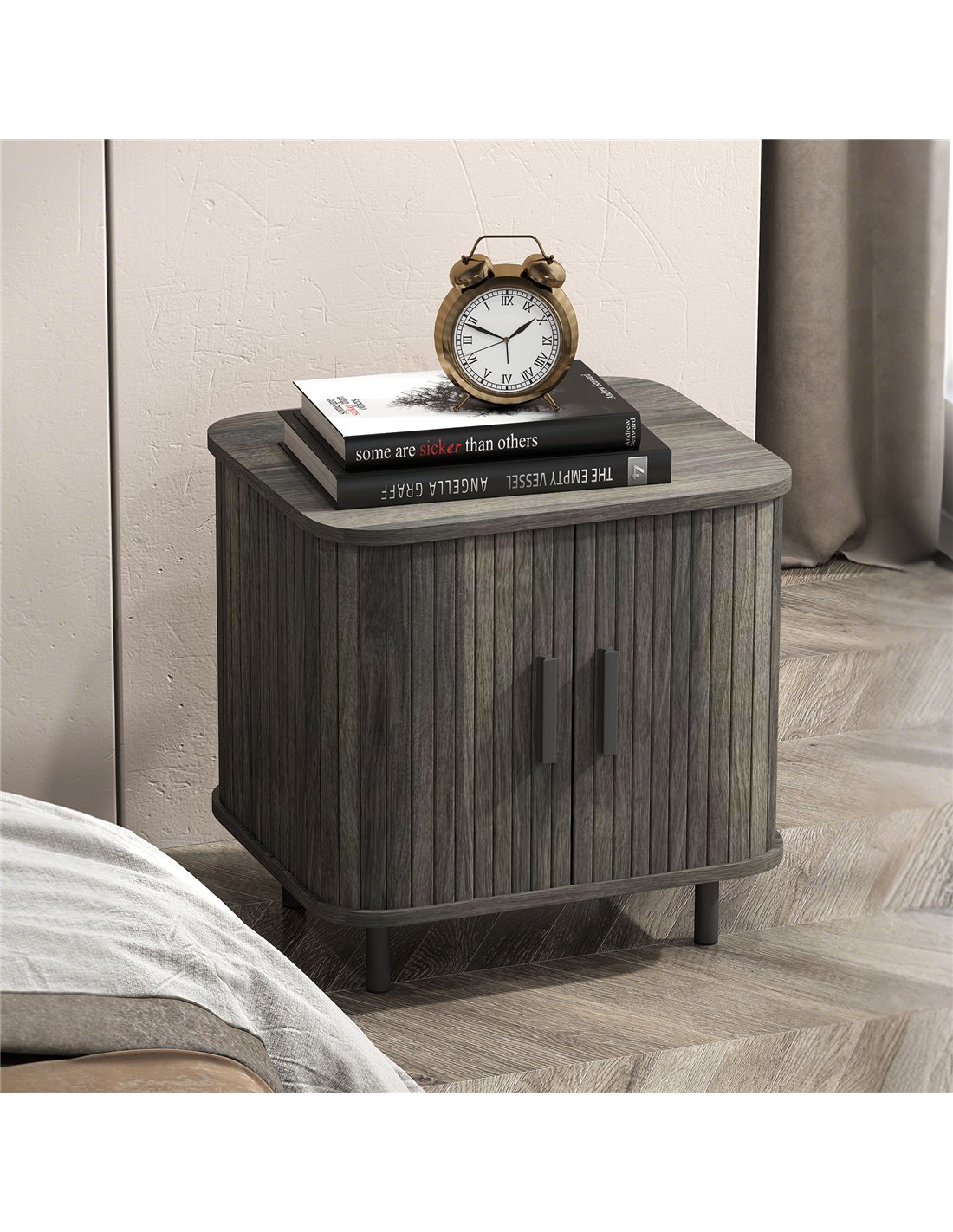 HOMCOM Bedside Table, Nordic Side Table with Roller Shutter Style Sliding Doors and Metal Legs for Bedroom, Living Room, Grey