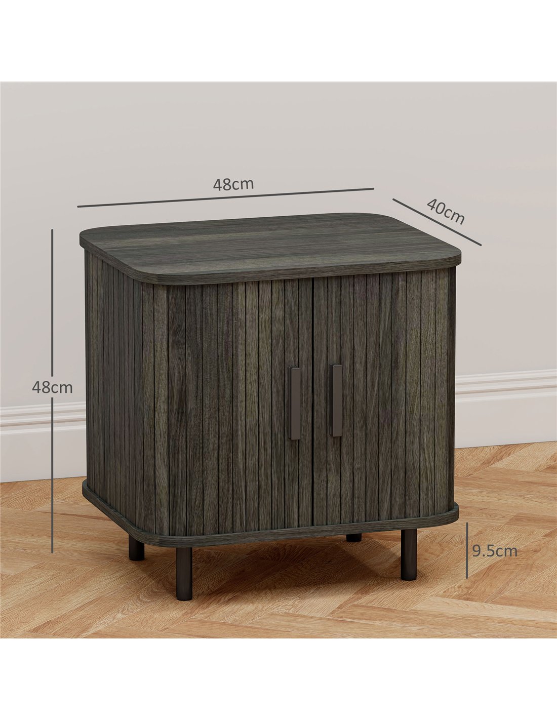 Elevate your British home décor with the HOMCOM Nordic Bedside Table, presented in a versatile grey finish. This side table features unique roller shutter style sliding doors, offering smooth access to two tiers of organised storage while saving valuable room space. Its robust construction combines durable particleboard with strong steel legs, providing a secure total weight capacity of 90kg. The table's melamine surface ensures resistance to scratches, guaranteeing long-term durability and maintaining its aesthetic. Position this piece as a practical nightstand, a chic end table, or a convenient sofa side table in any bedroom or living room setting. Integrated protective foot pads prevent floor damage, and the elevated base allows for easy cleaning underneath. This piece expertly blends contemporary Nordic design with essential functionality, making it a perfect addition to UK homes.