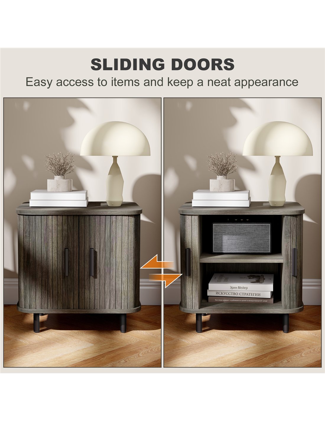 - Sliding doors allow easy access without extra space needed