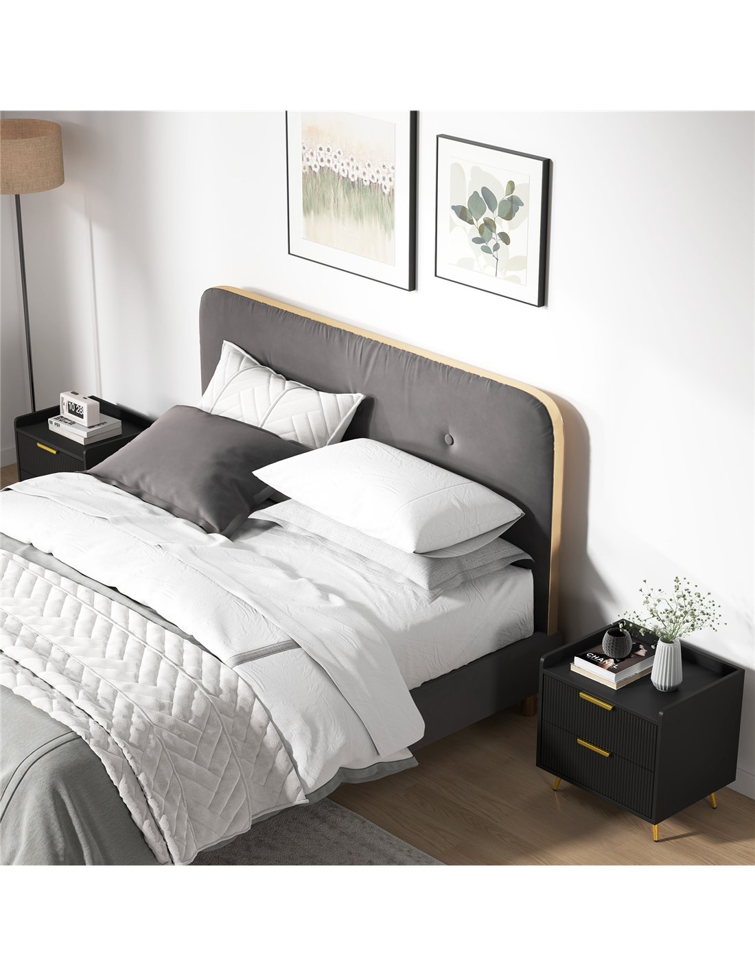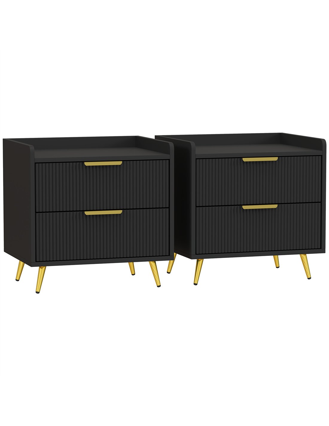 Enhance your bedroom with the HOMCOM Elegant Two-Drawer Bedside Table Set of 2 in black. This essential set offers sophisticated storage and a refined aesthetic. Each nightstand features a solid black finish, complemented by distinctive ridged drawer fronts and sleek gold-tone handles. These design elements provide a bold, elegant style suitable for any contemporary British home. Organise your bedtime essentials efficiently within two spacious drawers. The flat tabletop includes low-rise walls, offering a secure space for lamps, books, or decor. Crafted from stable MDF with strong, supportive metal legs, these tables ensure daily reliability and lasting performance. They arrive ready for straightforward assembly, providing robust support and optimal functionality. This practical and stylish furniture solution from FastDaddy elevates your bedroom's comfort and appearance.