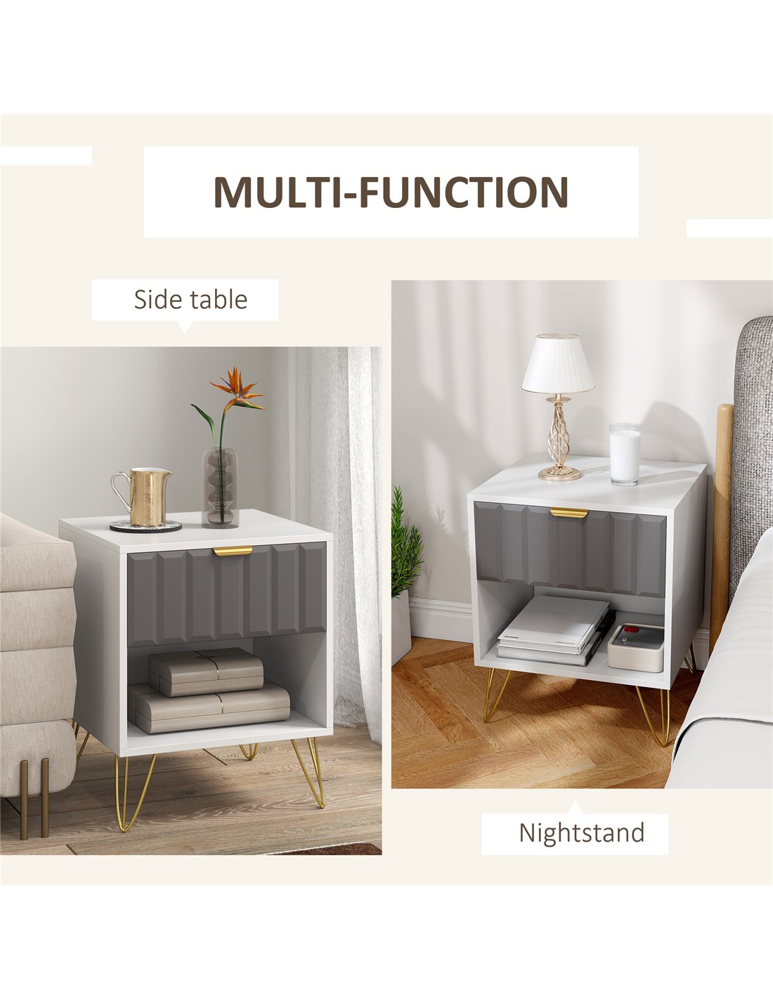 Enhance your bedroom with the HOMCOM Modern Bedside Table, a functional and stylish addition to your home. This compact bedside cabinet provides essential storage right where you need it. Featuring a flat countertop, an open shelf, and a smooth-gliding drawer, it keeps your essentials organised and accessible. Its versatile design allows use as a practical side table in your living room or office. Constructed from durable particleboard and MDF, supported by robust steel legs, this unit offers lasting stability. The white finish with a coated surface and 15-centimetre gap clearance ensures effortless cleaning. A convenient handle completes the drawer, ensuring smooth operation. This design maximises convenience and complements modern interiors.