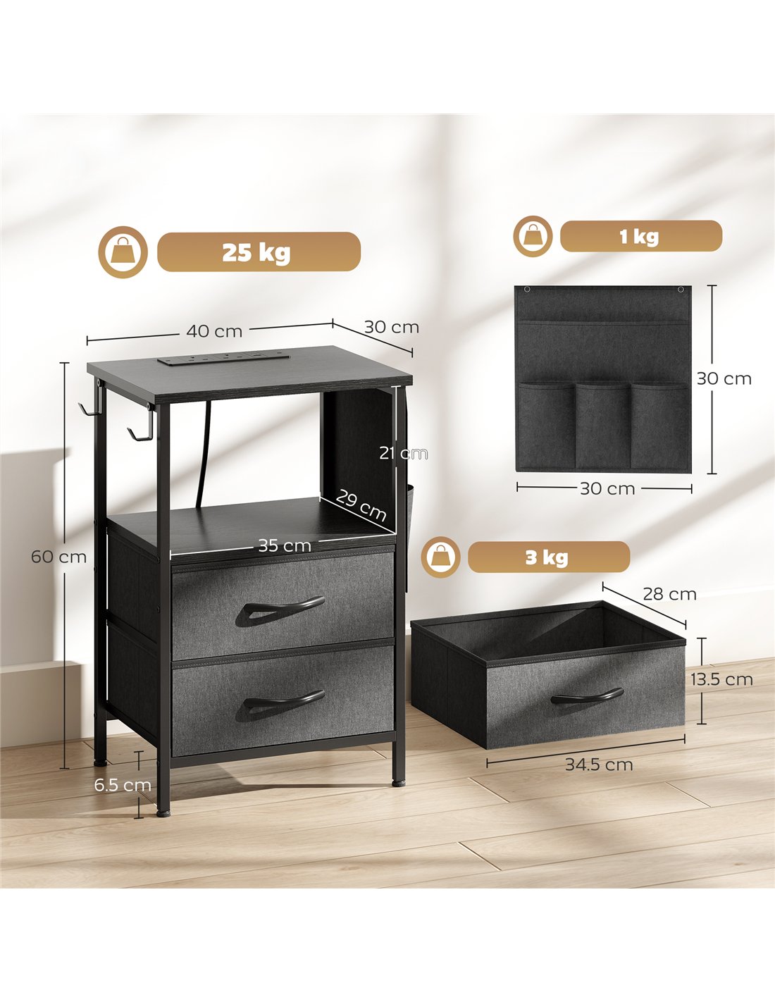 - Maximum Load: 10 kg (top/open shelf), 3 kg (drawer), 1 kg (fabric pouch/hook), 25 kg (total)