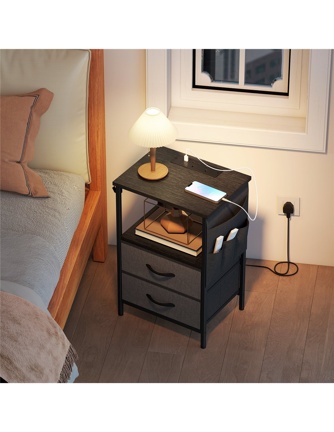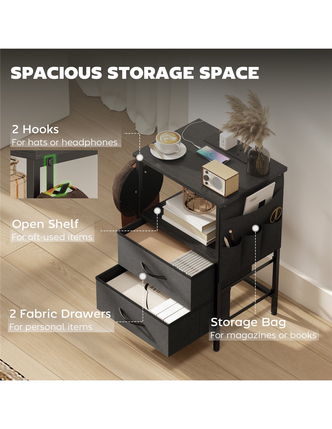 - A: This table features a 5-in-1 storage design. It includes an open shelf, a fabric drawer, and a side storage bag. This offers ample space for all your bedroom essentials.