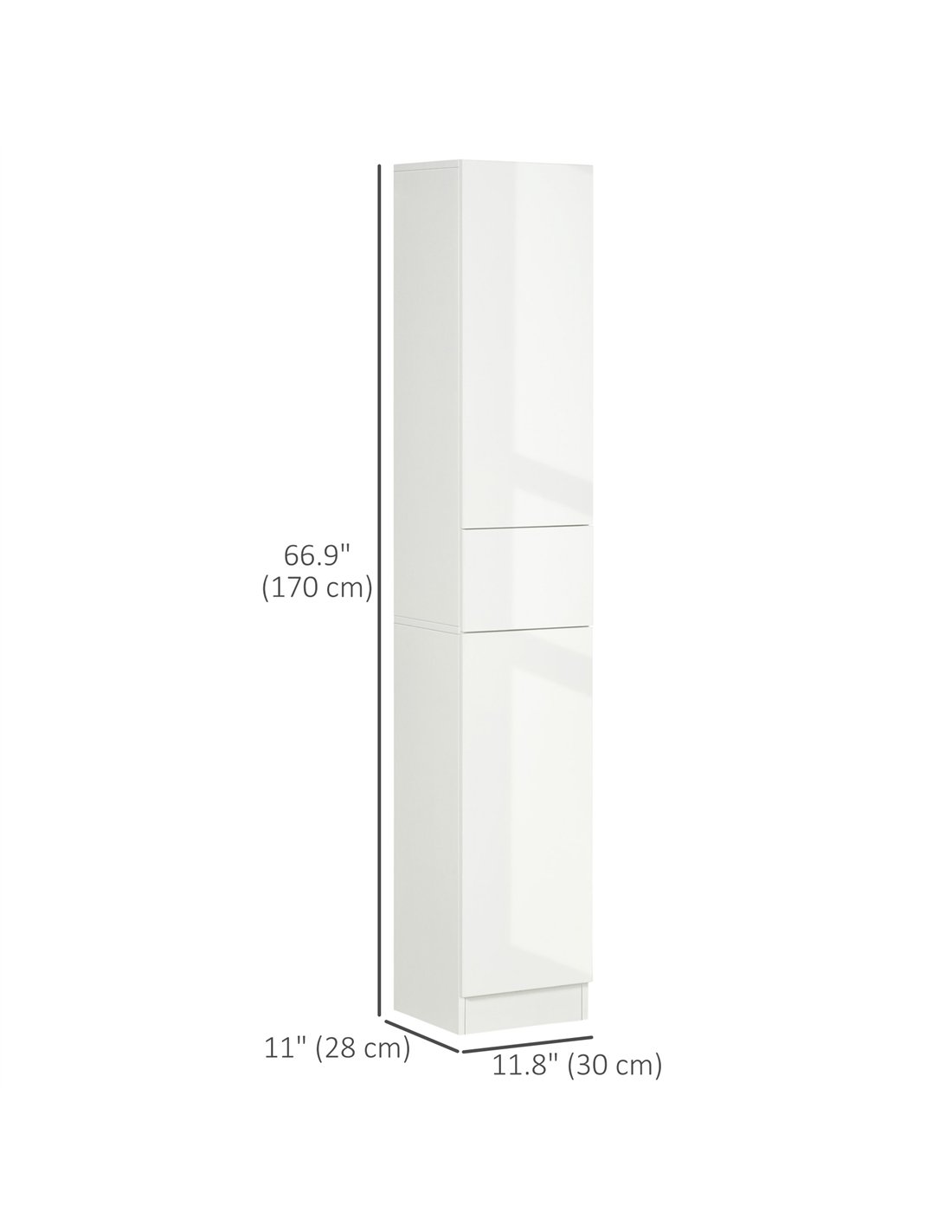 Optimise your compact living space with the kleankin Luxury Tall Bathroom Cabinet. This sleek white unit, featuring a high gloss panel, reflects light to create an impression of greater space within your UK bathroom. Designed for both style and efficiency, its push-to-open door mechanism provides a seamless, handle-free aesthetic. Crafted from strong particleboard and MDF, this durable 170cm tall cabinet offers robust support for all your bathroom essentials. It includes two generous cupboards and a functional drawer, providing ample room for thorough organisation. An adjustable shelf within allows you to tailor storage to your specific needs. Anti-tipping straps ensure secure placement, enhancing safety in any home. This modern and practical piece integrates clean design with essential functionality, making it the perfect choice for maximising storage in narrow spaces.