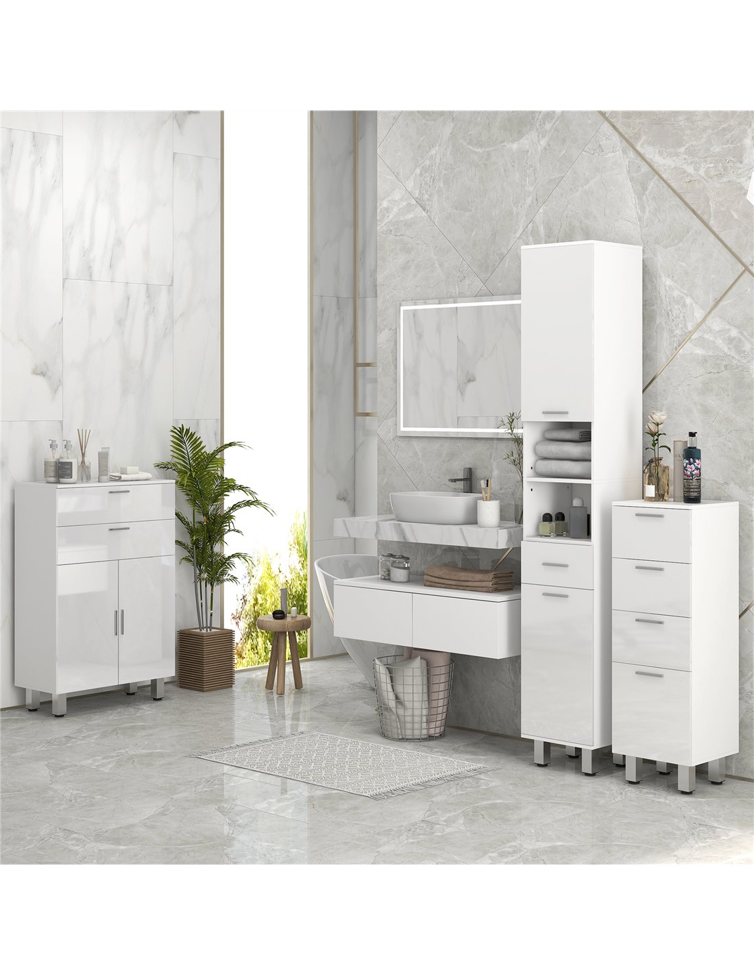 - Two open shelves, a drawer and two 2-tier cabinet neatly arrange your towels, linen and other bathroom essentials