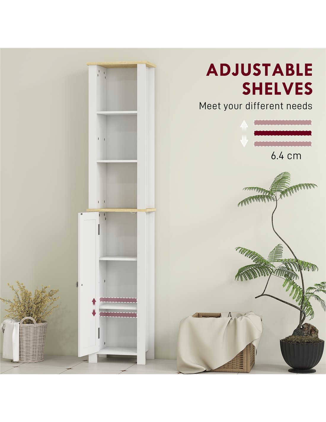 The kleankin Slim Bathroom Storage Unit, available from FastDaddy, provides essential organisation for UK bathrooms. This white storage cabinet, measuring 34W x 23D x 165H cm, offers a space-saving solution, ideal for smaller areas. It features three open compartments and a three-tier cupboard, delivering versatile storage for towels, hygiene products, and cleaning supplies. The adjustable inner shelf allows customisable arrangements within the cabinet. A clean white design with a wood-effect top ensures it integrates seamlessly into your existing decor. A smooth, protective paint coating enhances durability. The round handle and magnetic door provide easy access to the cupboard. Anti-tipping straps are included for secure, safe placement. This unit supports a total weight of 18kg, with 6kg for the cupboard and 3kg for individual shelves or the top.