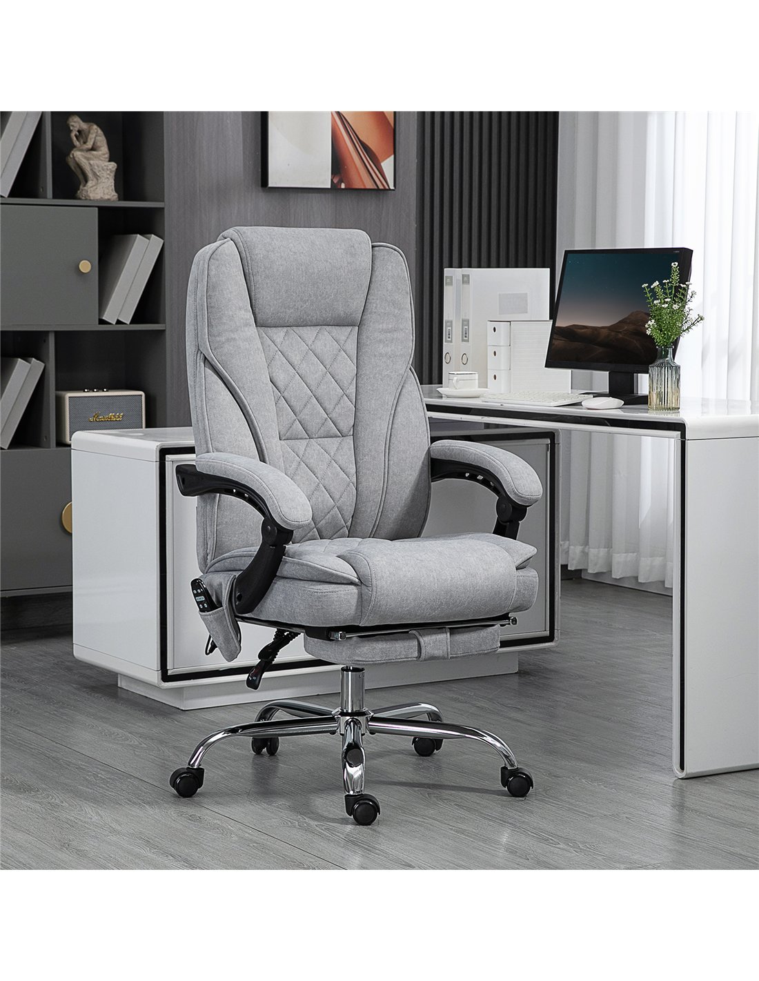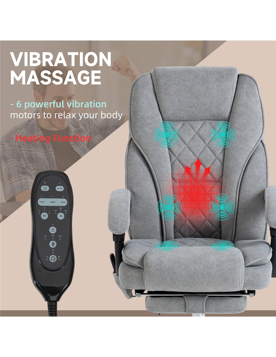 Upgrade your workspace with the Vinsetto Massage Office Chair, designed for optimal comfort and support. This heated reclining computer chair, in a sophisticated grey, serves UK residents seeking enhanced productivity and relaxation. Experience targeted relief with a six-point vibration massage system, offering three modes and intensity levels. Benefit from a three-stage lumbar heating function, ideal for soothing muscles. Adjust the seat height effortlessly using a reliable class-3 gas lift. Recline up to 135 degrees and extend the integrated footrest for complete relaxation during breaks. The soft, velvet-feel fabric provides a stylish and comfortable seating solution. This versatile chair functions effectively as a comfortable office chair, a dedicated PC gaming chair, or a professional executive chair for any home office environment. Enjoy smooth mobility across all floor types with durable PU wheels.
