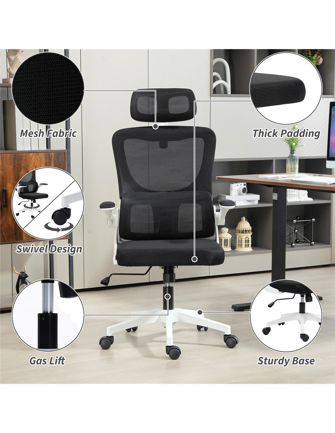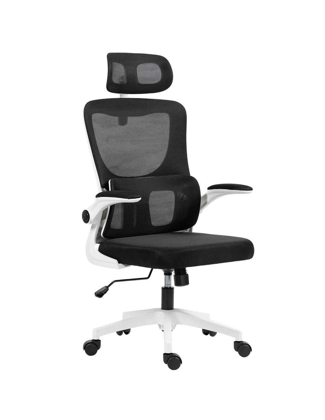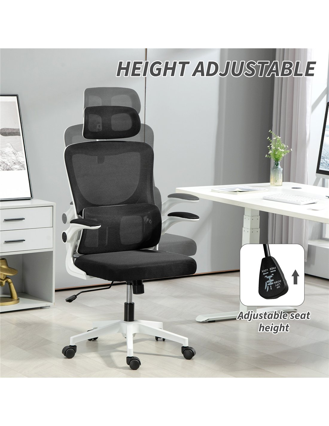 Optimise your UK home office with the Vinsetto Ergonomic Office Chair. This high-back mesh computer desk chair offers comprehensive support for extended work or study sessions. Its dual-back design provides flexible support, relieving pressure after long hours at your desk. Enjoy personalised comfort with an adjustable headrest, also removable for easy cleaning, and integrated lumbar support. Rotatable armrests offer a practical space-saving solution, making this black office chair suitable for compact rooms and apartments. The breathable mesh back and sponge-padded seat ensure cool, comfortable all-day use. Adjust the chair height and utilise the rocking function to find your optimum relaxing position. A 360° swivel seat and smooth-gliding wheels facilitate effortless movement across your workspace. FastDaddy delivers this functional chair for enhanced productivity. Assembly is required.