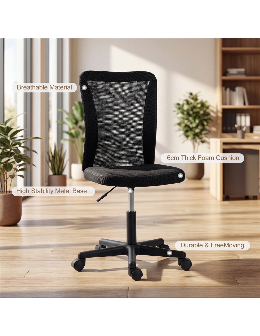 Enhance your workspace with the Vinsetto Computer Desk Chair, an armless mesh office chair designed for comfort and efficiency in any UK home or office. This black office chair combines a breathable mesh back with a thick padded sponge seat, ensuring sustained comfort during long workdays. Its ergonomic, curved back provides essential support. You get seamless movement across your office space with five robust rolling wheels and a stable metal base. The adjustable height feature allows you to customise your seating position from 85 cm to 97 cm, adapting to various desk setups. Its armless design enables the chair to tuck neatly under your desk, making it ideal for smaller offices or home working environments. This durable chair supports weights up to 120 kg, offering reliable stability. Achieve optimal productivity and maintain comfort throughout your day.