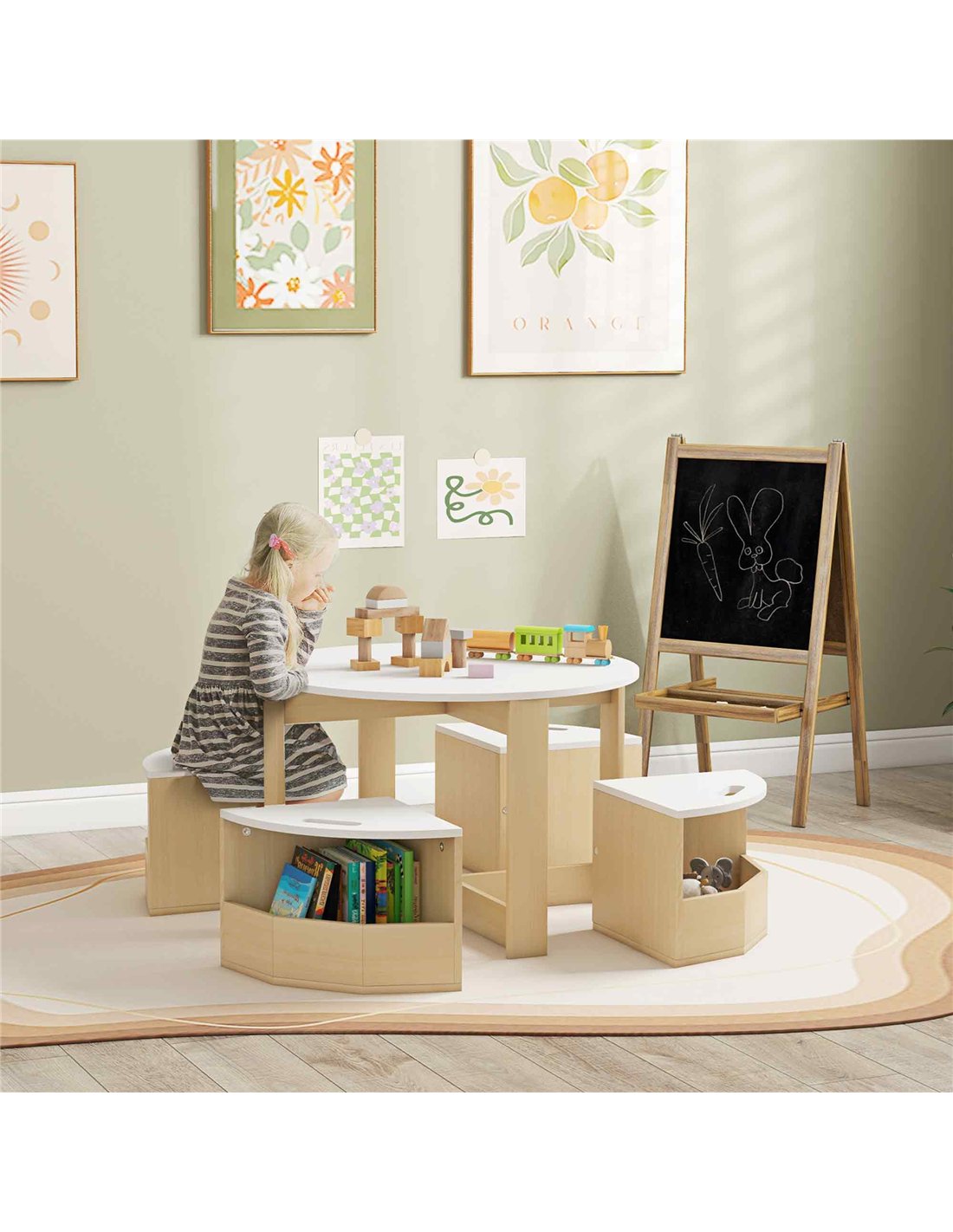 - A: Each of the four chairs features built-in storage compartments under the seats. This keeps toys, books, and other items organised.