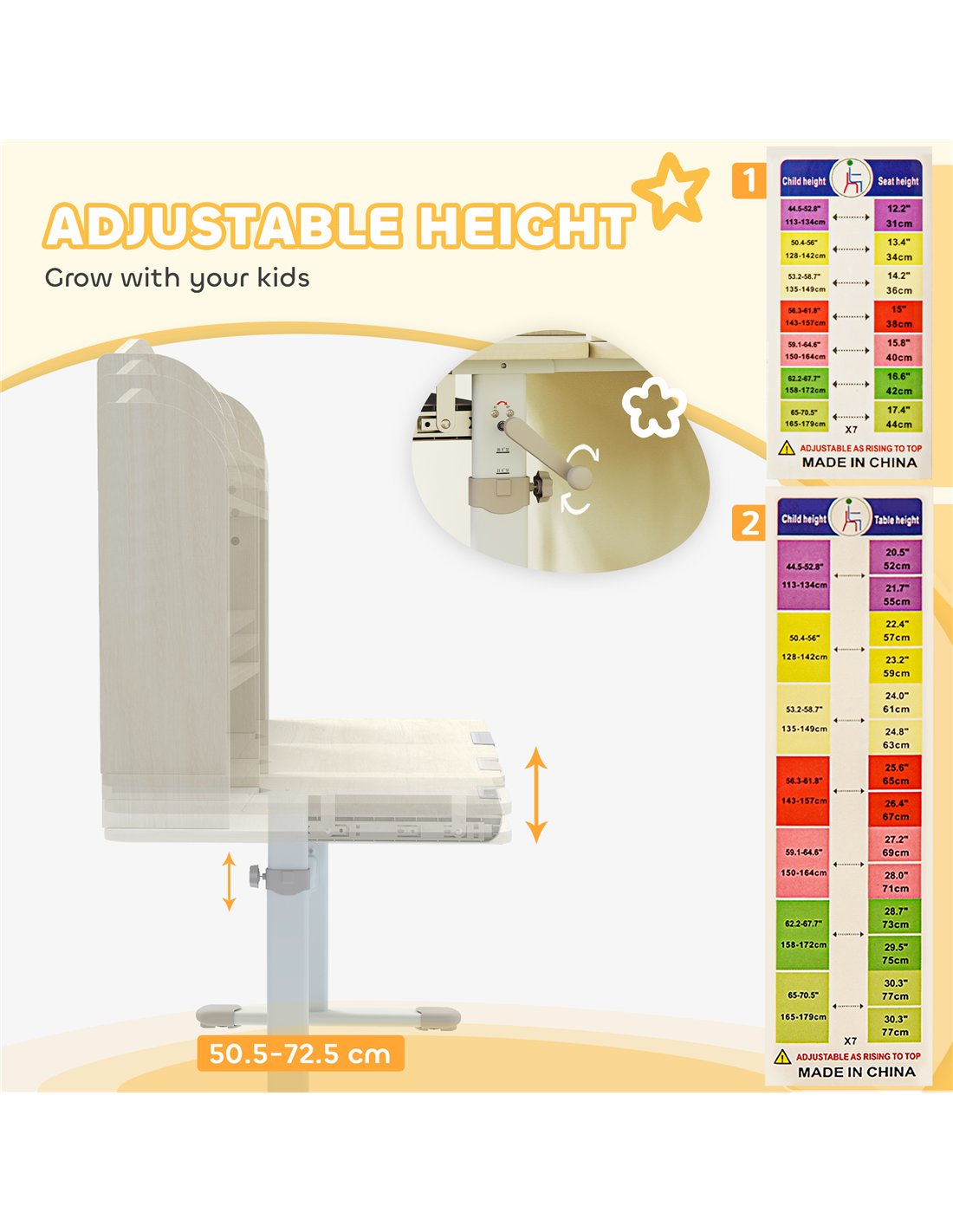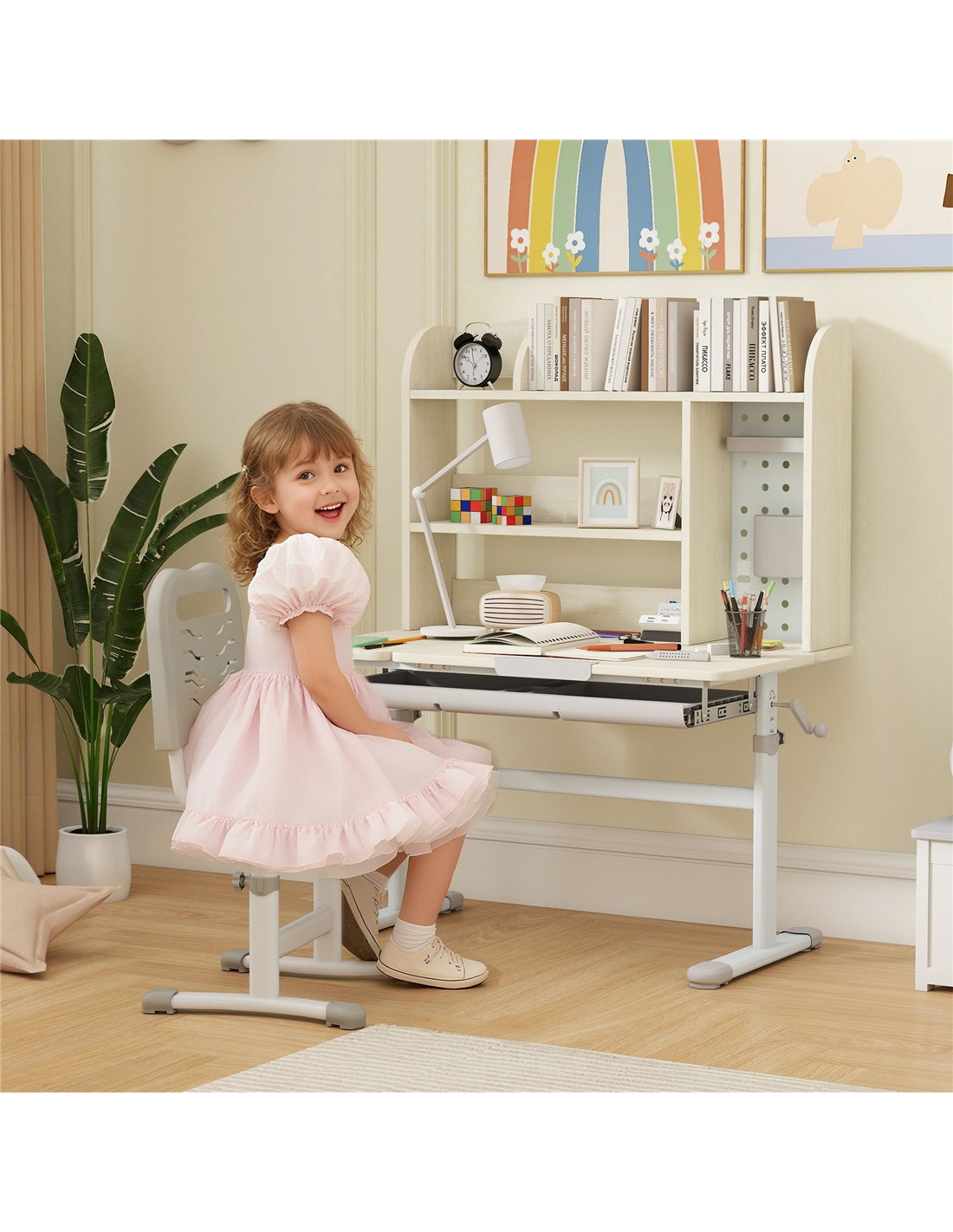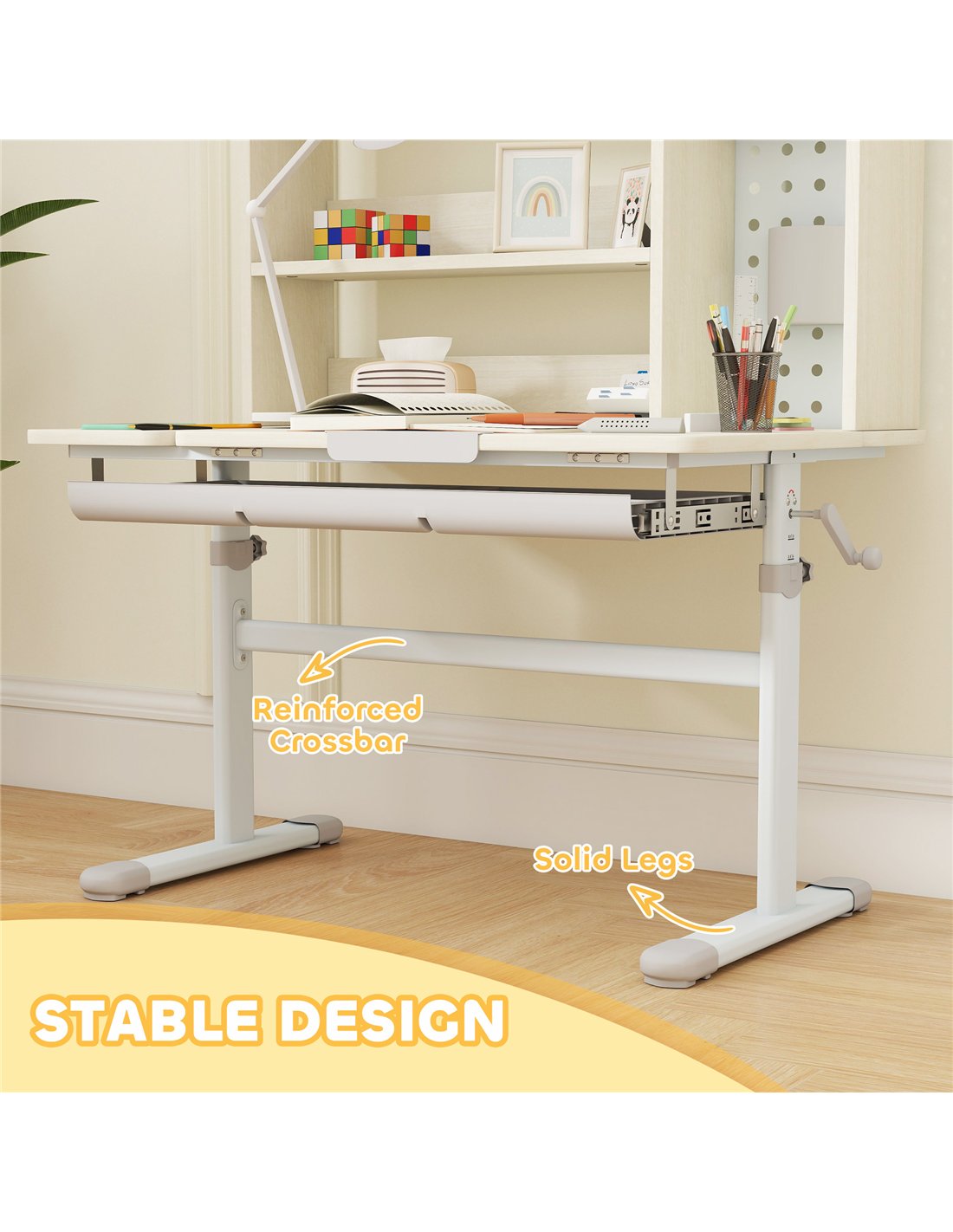 The AIYAPLAY Kids Desk in Natural provides a dynamic learning and creative space for children aged 3 to 12 years. This height-adjustable desk adapts as your child grows, promoting correct posture and comfort during study, drawing, and reading. A simple hand-crank mechanism adjusts the desk height from 50.5 cm to 72.5 cm. The desktop tilts up to 45°, offering optimal angles for various activities and reducing strain. Its spacious 80 cm wide surface gives ample room for schoolwork and artistic projects. Integrated storage, including a hutch, drawer, and pegboard, organises all essentials, from books and pens to craft supplies. Constructed from MDF and steel with rounded corners, this durable desk ensures stability and safety for daily use. This versatile desk supports your child's developmental journey through their primary years, fostering organisation and focus.