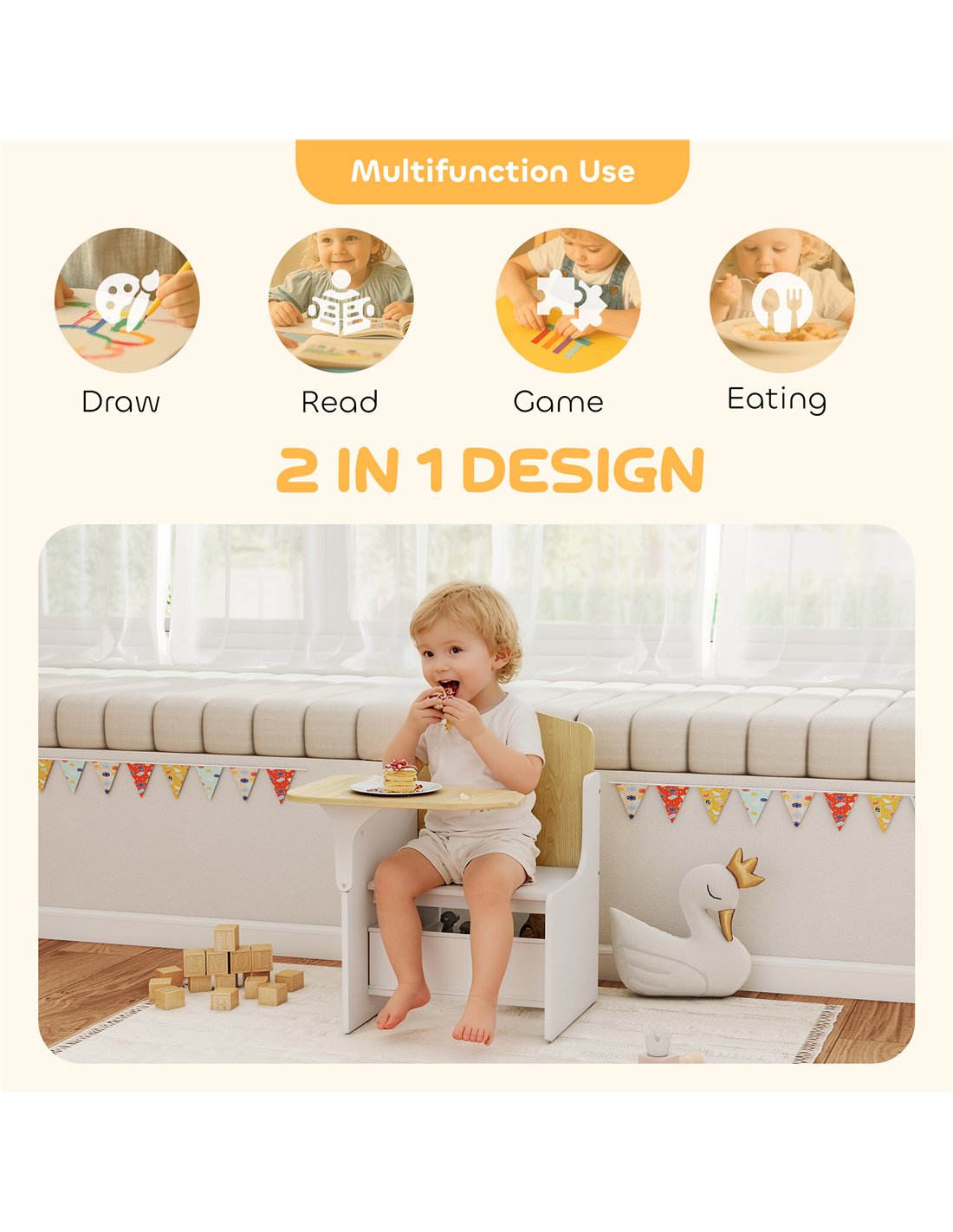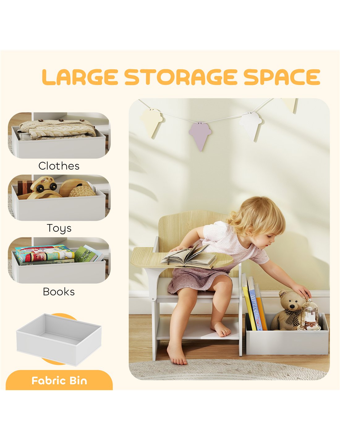 - Includes a storage box under the seat, promoting tidy-up habits