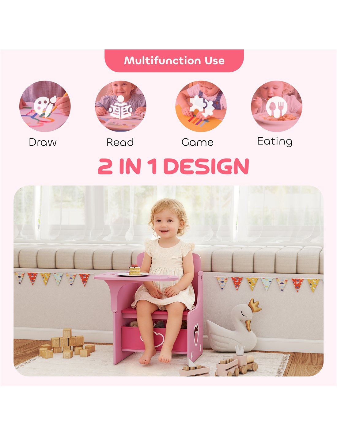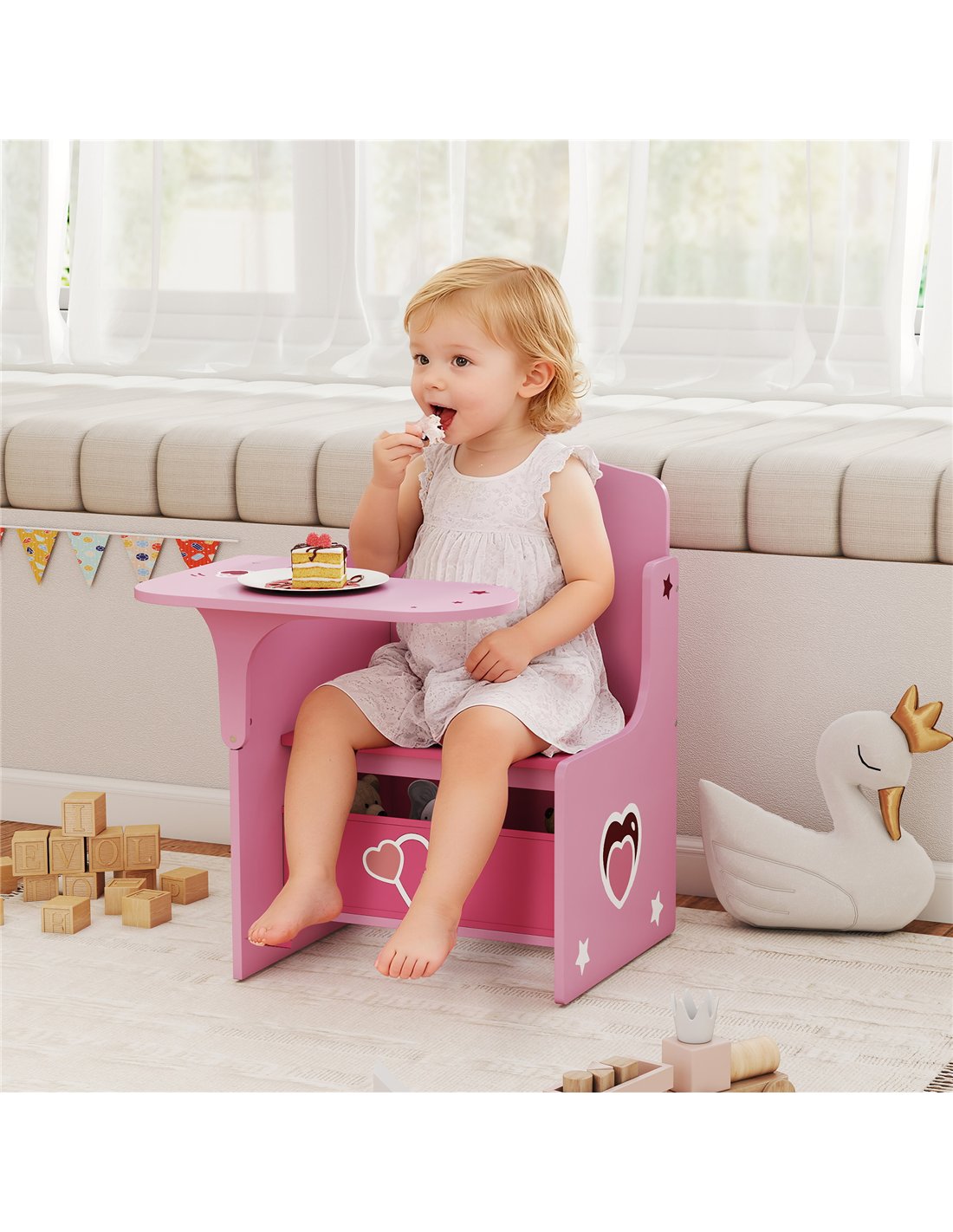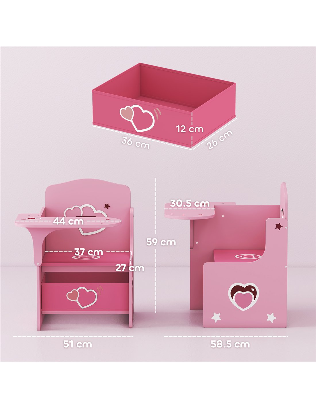 - Includes a storage box under the seat, promoting tidy-up habits