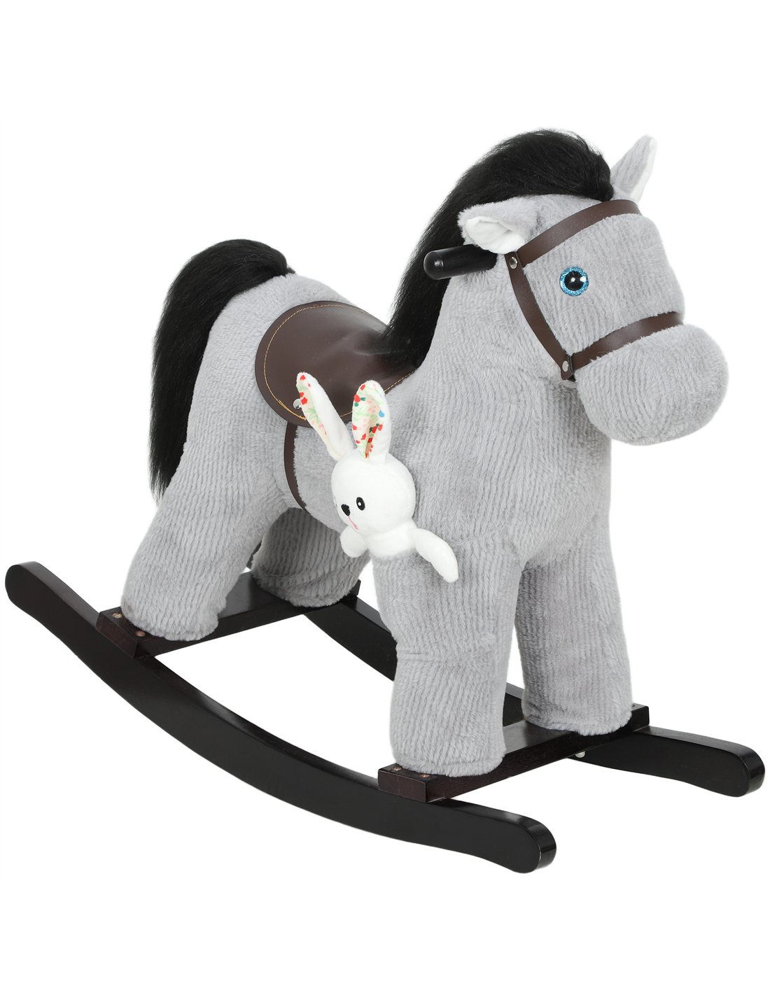 The AIYAPLAY Baby Rocking Horse is a grey plush ride on toy designed for toddlers aged 2-5. This animal rocker provides a secure and engaging play experience. Your child benefits from a robust steel and poplar wood frame, ensuring stability during use. Soft plush fabric and thick PP cotton filling offer superior comfort for extended playtime. The design supports up to 40kg, making it a dependable companion. Interactive features enhance imaginative play. Squeeze the ear to activate realistic sounds, inspiring adventurous rides. An included rabbit toy offers additional companionship and doubles the fun. The 35cm seat height is specifically tailored for young children. This rocking horse serves as a thoughtful gift, promoting active play and creating cherished family memories. Its construction meets EN71-1-2-3 safety standards.