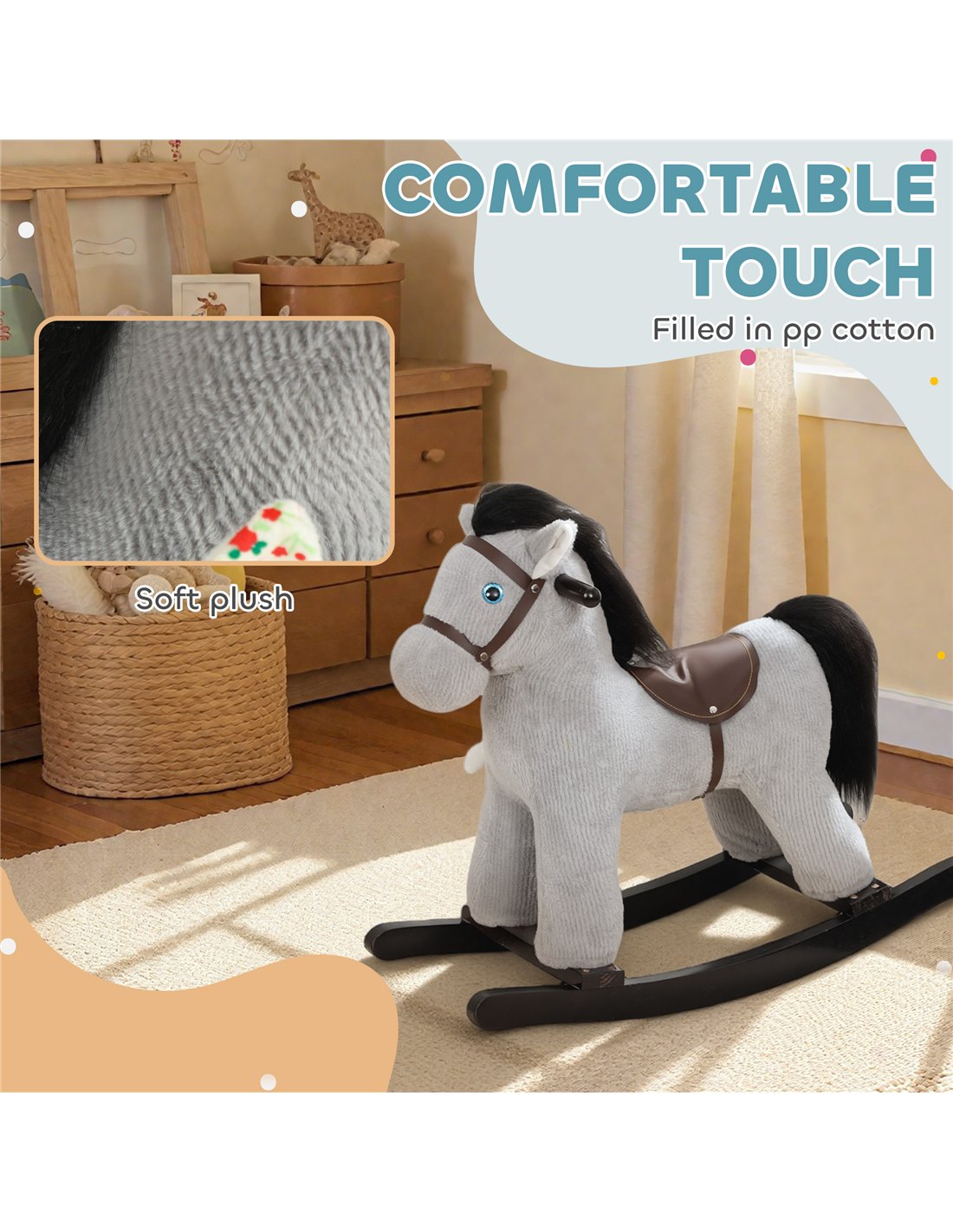 - A: The rocking horse uses PP cotton and soft plush fabric for comfort. Its frame consists of metal and poplar wood.