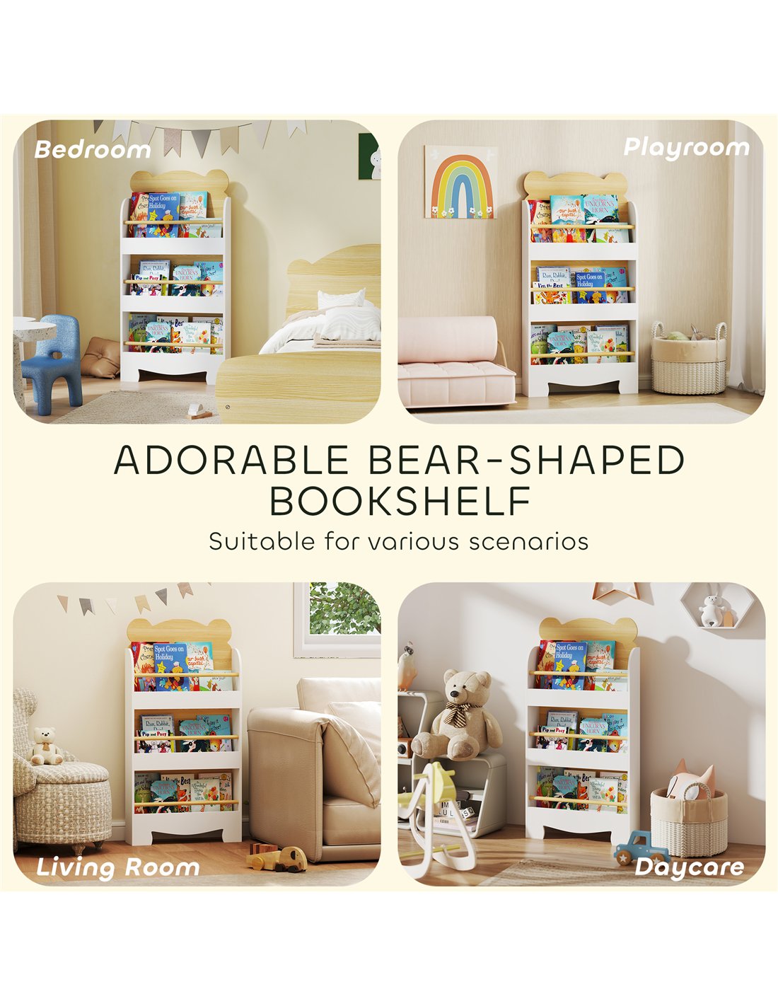AIYAPLAY Kids Bookshelf, 3 Tier Children Bookcase, Bear Theme Toddler Space-Saving Bookcase for Living Room, White