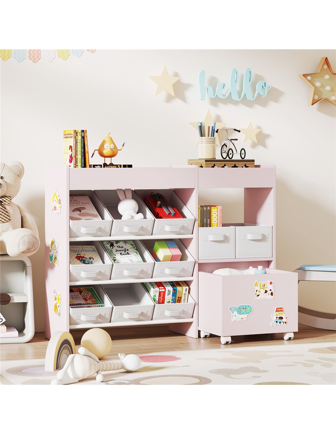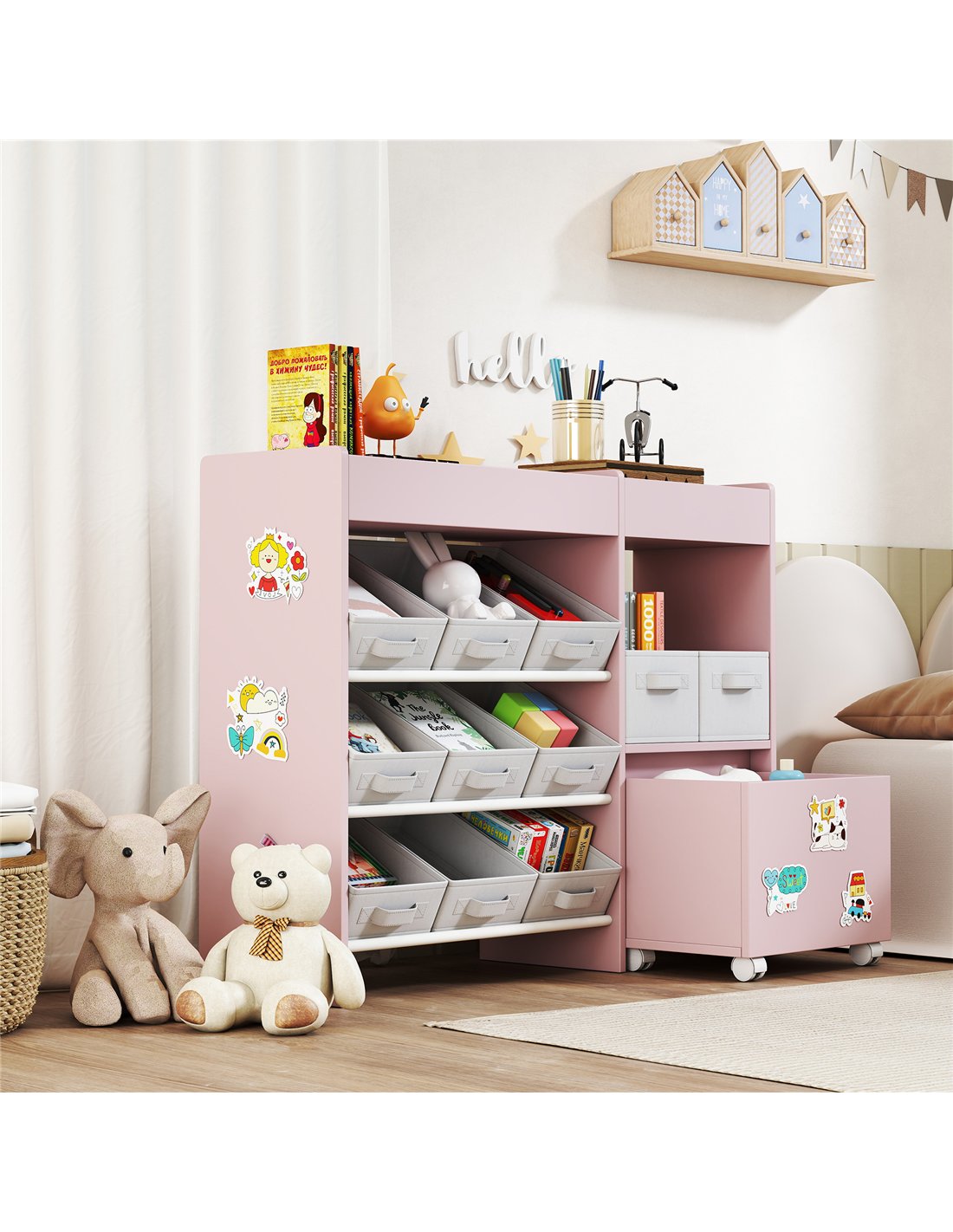 AIYAPLAY Kids Toy Storage Unit with 11 Bins, Cabinet, Top Shelves, 3 Stickers, for Nursery, Playroom, Pink