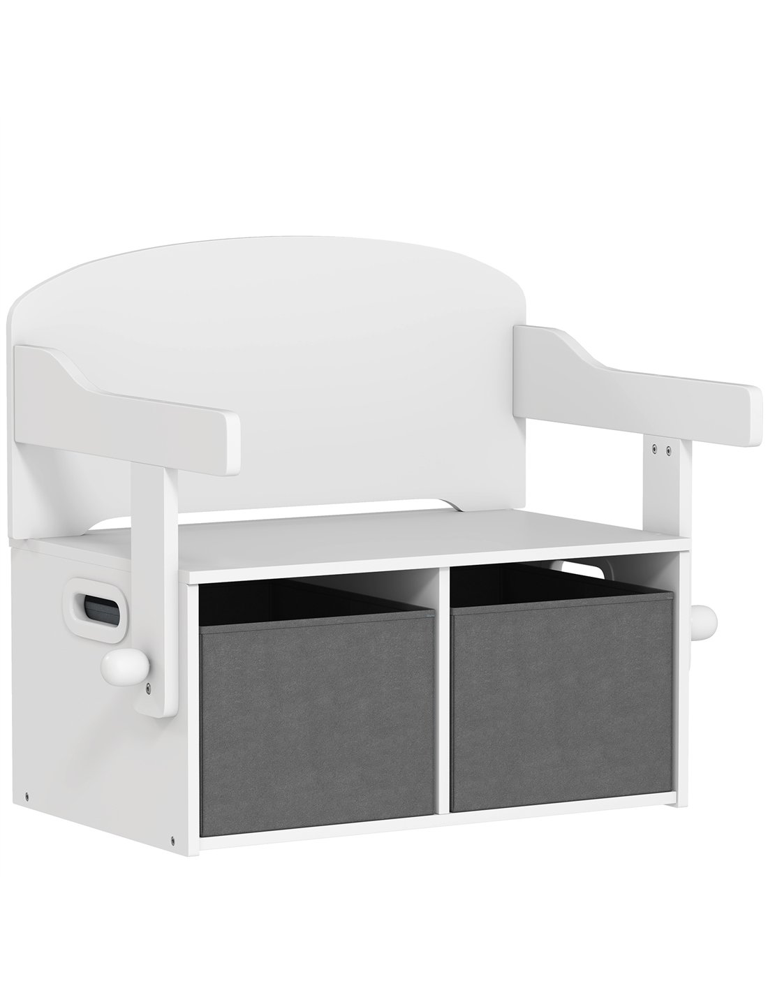 Reclaim your child's play area with the AIYAPLAY 3 in 1 Kids Storage Bench. This versatile white unit instantly transforms from a comfortable bench into a functional table and chair set. It provides a dedicated space for creative activities and focused play. Say goodbye to toy mess; two integrated pull-out fabric bins make tidying up simple and encourage independence. Built from stable MDF with safe rounded corners, this piece ensures durability and child safety. Its stylish white and grey design complements any room decor. Designed for children aged 3 to 6 years, it supports healthy posture during drawing, reading, and imaginative play. This convertible storage bench delivers practicality and organised fun for your home, offering a safe and engaging environment for your little one's development.
