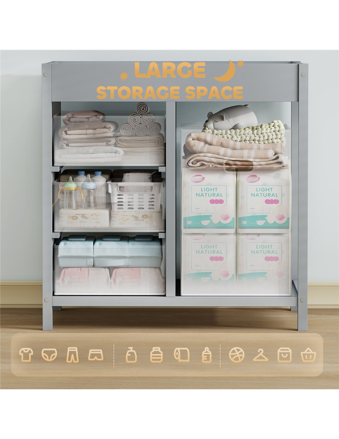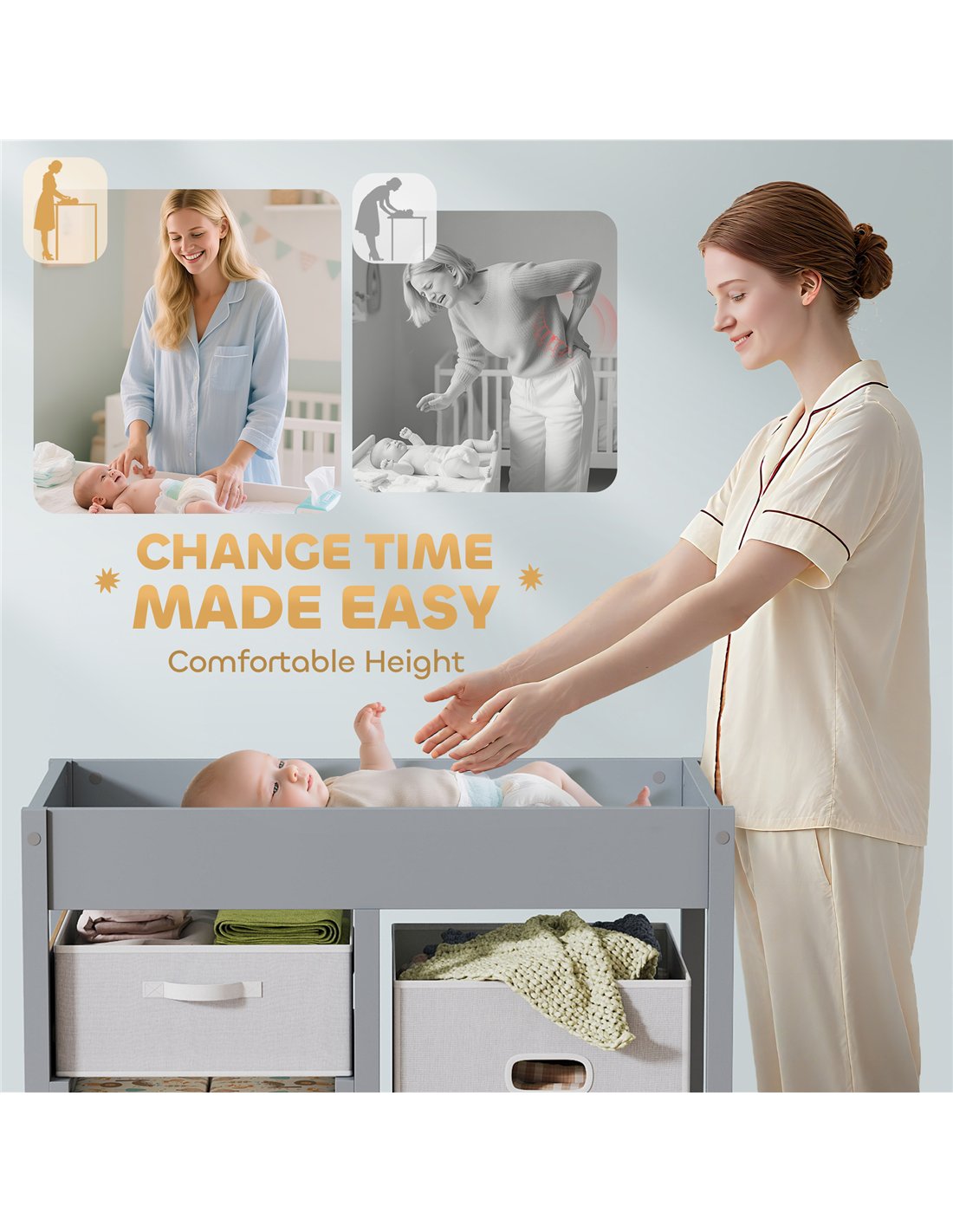 - Functions as a baby changing table and daily care station