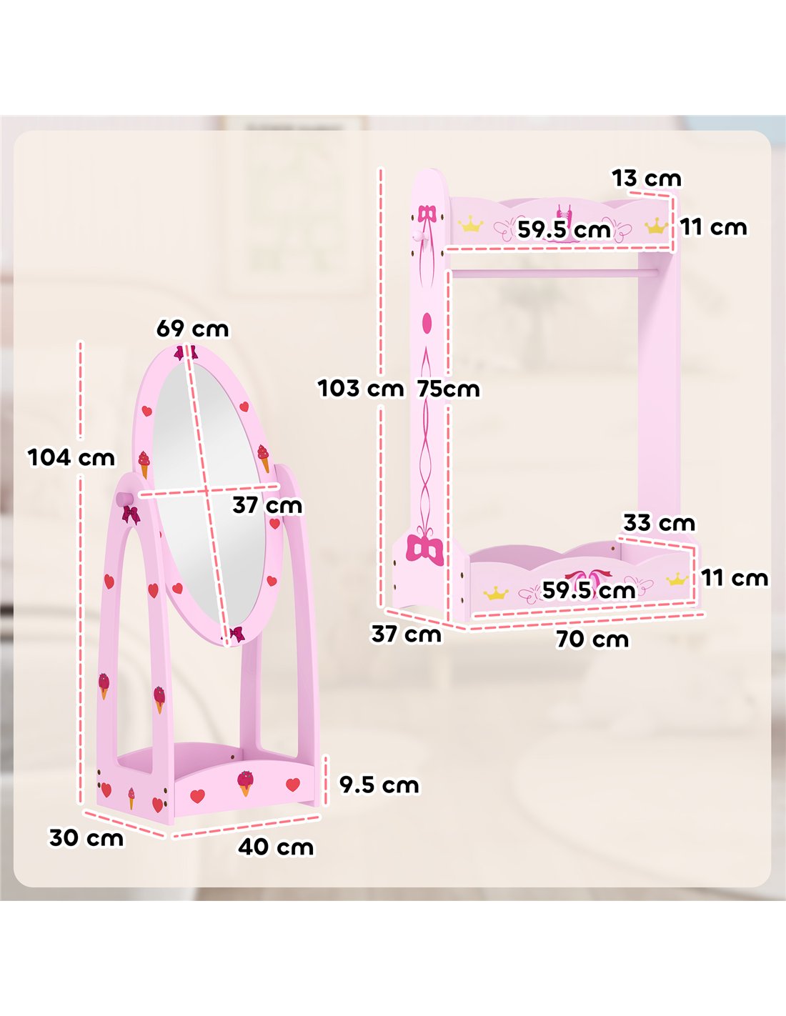 AIYAPLAY Kids Clothes Rail, Kids Dressing Mirror with 360° Rotating, 2 Piece Kids Furniture Set with Storage Shelves, Pink