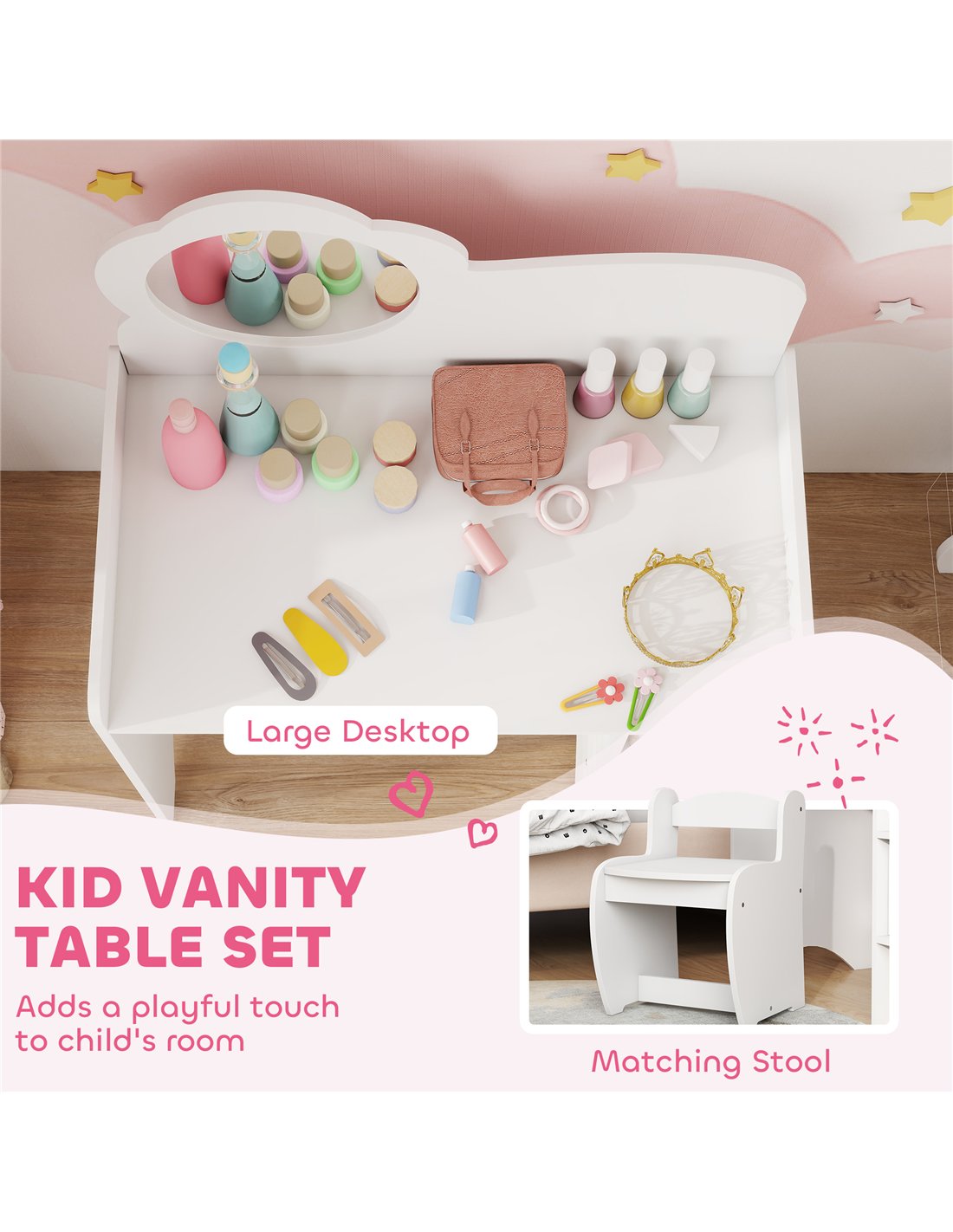 Provide your child with their own dedicated space for imaginative play. The AIYAPLAY Kids Dressing Table set, complete with a mirror, stool, and shelves, offers a practical and engaging solution for children aged 3-8 years. This white vanity table from FastDaddy is designed for UK homes, providing a safe environment for morning routines, creative play, and hair styling. The adorable flower-shaped mirror adds a charming touch. Two open compartments maintain tidy storage for toys and accessories, reducing clutter. Crafted from durable MDF with a shatter-resistant acrylic mirror, this set prioritizes your child's safety. All edges are rounded, preventing bumps. This piece supports up to 20 kg on the table and 30 kg on the stool. Assembly is required to create this joyful, safe space for your little one.