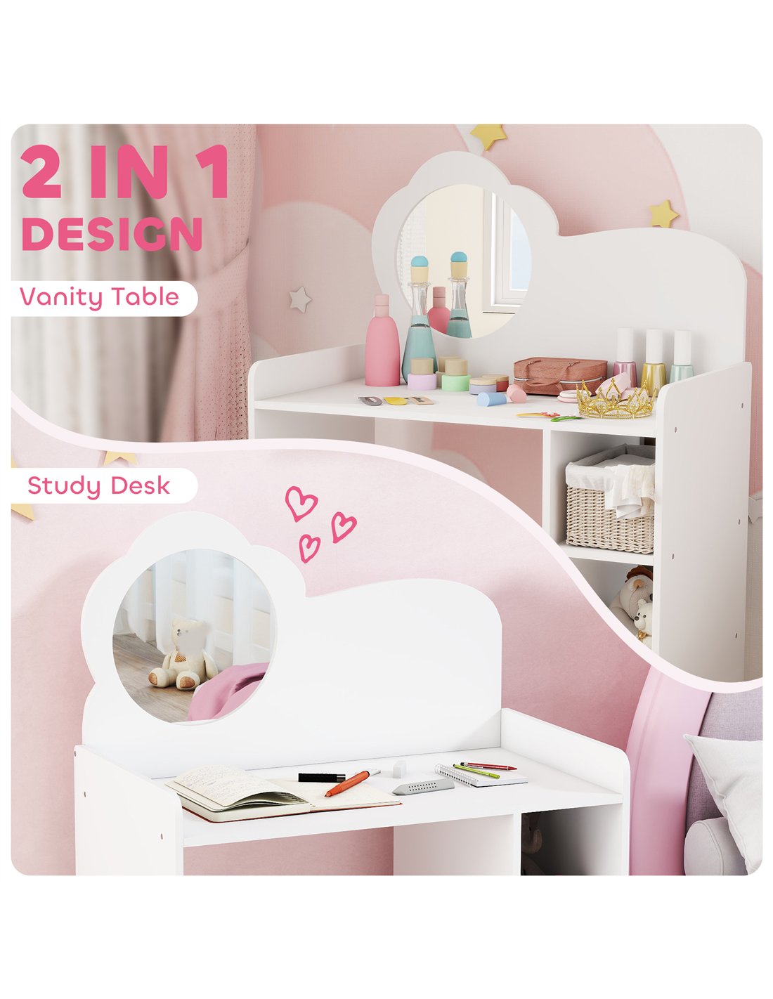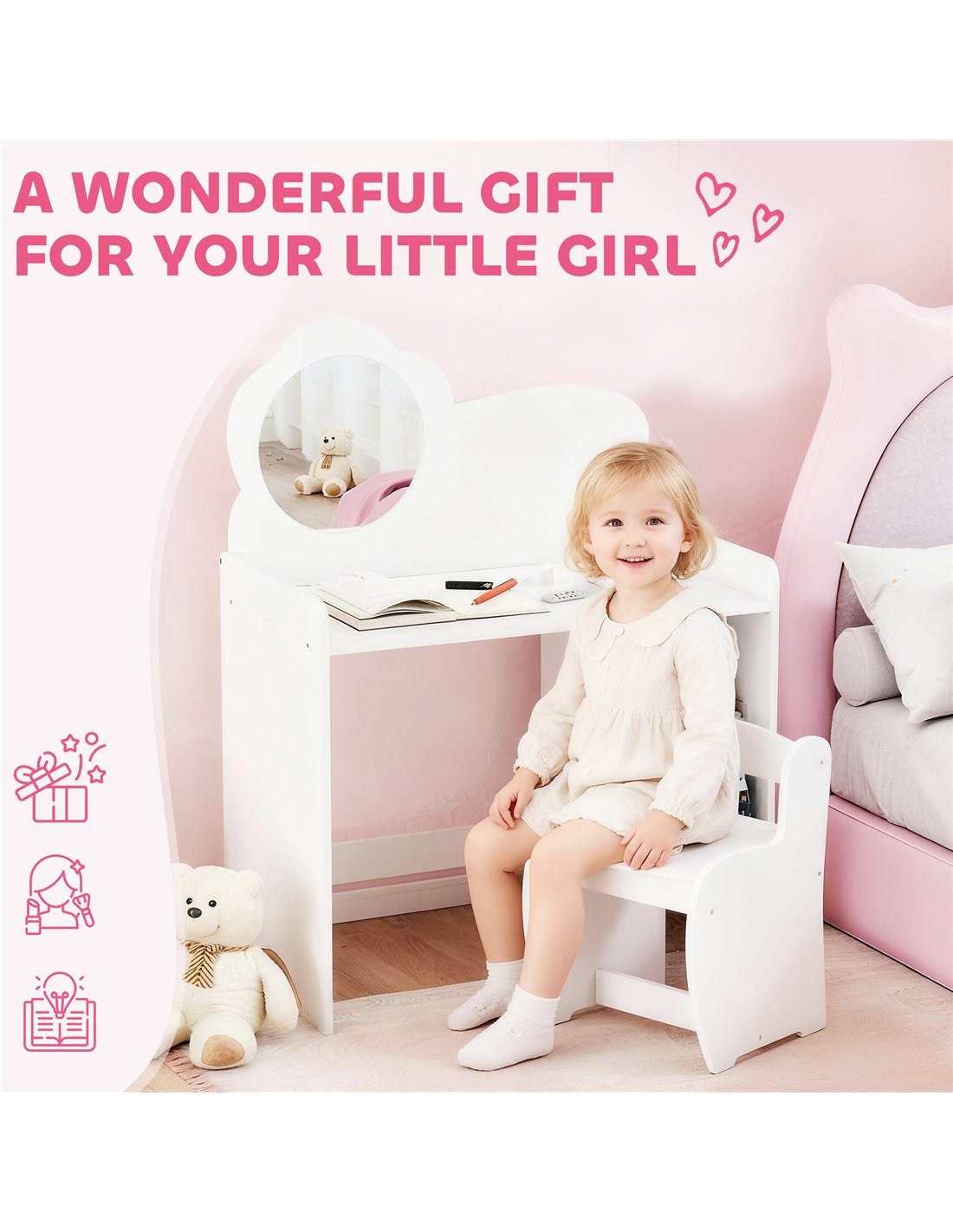 AIYAPLAY Kids Dressing Table with Mirror, Stool, Kids Vanity Table with Shelves, for Ages 3-8 Years, White