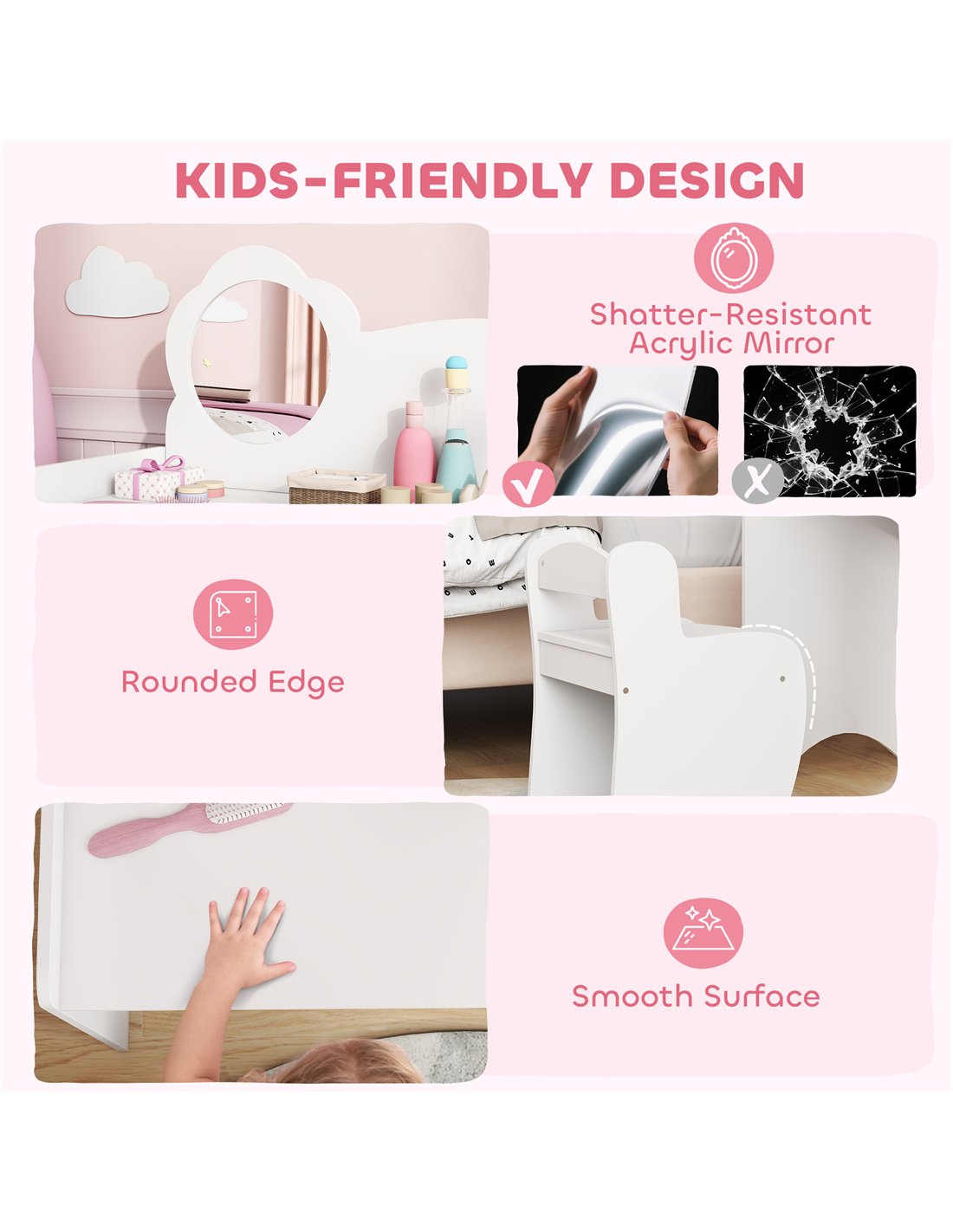 - A: The set features rounded and smooth edges, preventing accidental bumps. It also includes a shatter-resistant acrylic mirror and is constructed from MDF. It meets safety standard EN71-1-2-3.