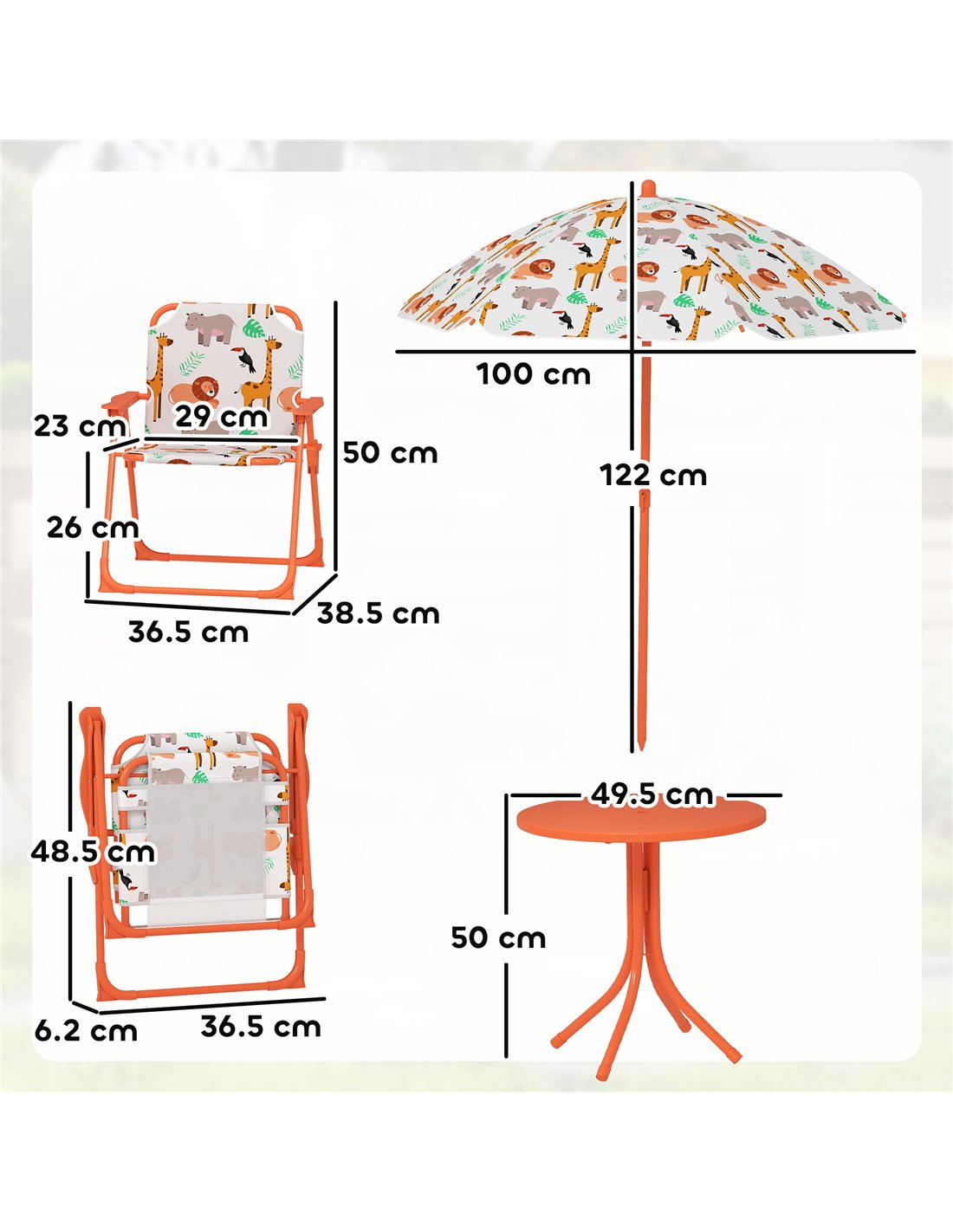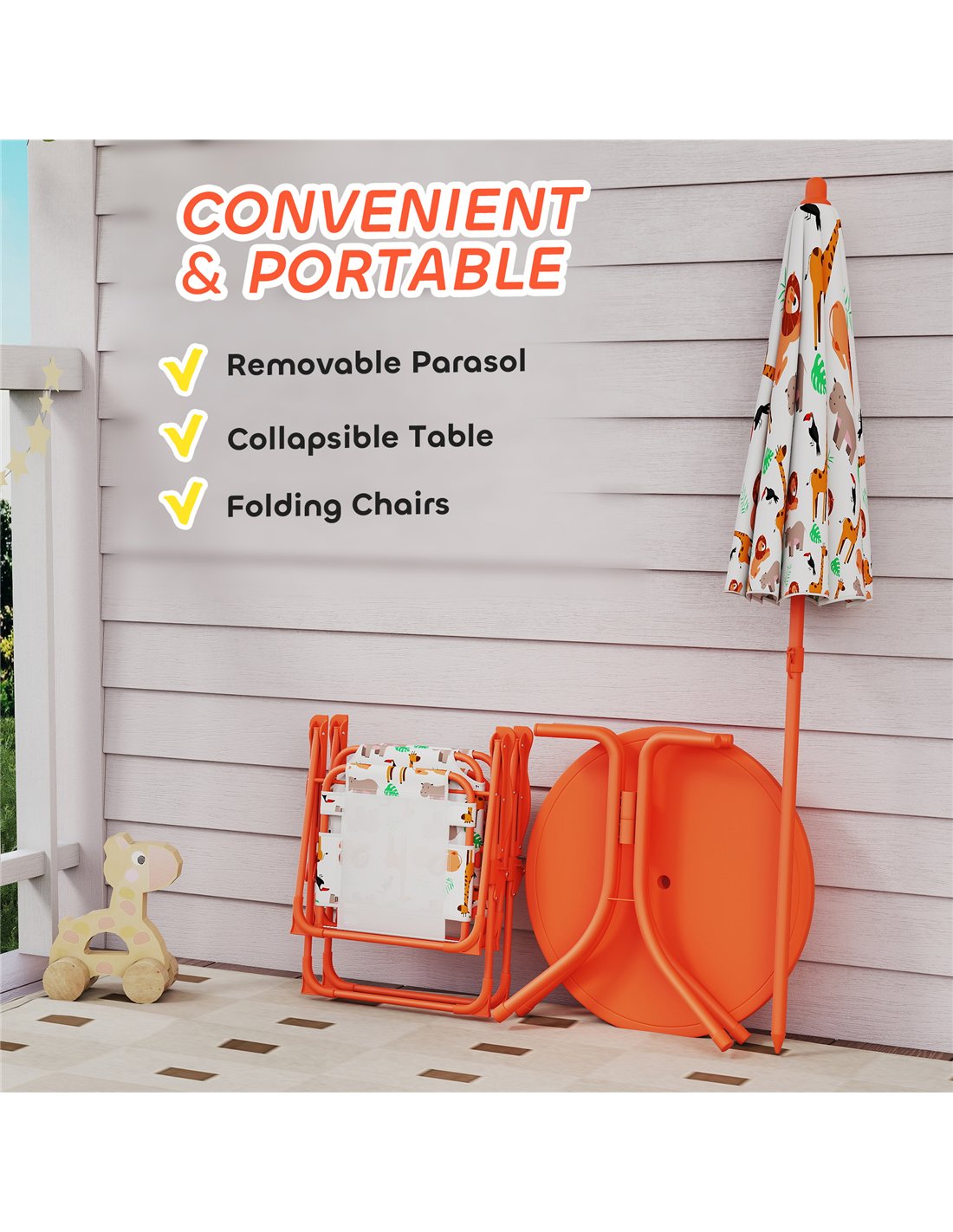 Elevate your child's outdoor adventures with the AIYAPLAY Kids Patio Set in Orange. This complete Children Table and Chair Set provides an ideal solution for organised play and comfortable relaxation. It features an Outdoor Picnic Table, two convenient folding chairs, and a large umbrella. The umbrella delivers essential sun protection, creating a shaded haven for endless fun in your garden or at the park. Crafted with a vibrant orange finish and a cute animal design, this set appeals directly to children aged 2-5 years. The chairs fold for easy transport, allowing simple setup anywhere. A stable steel frame ensures this children's garden furniture offers durability and consistent use, indoors or outdoors.