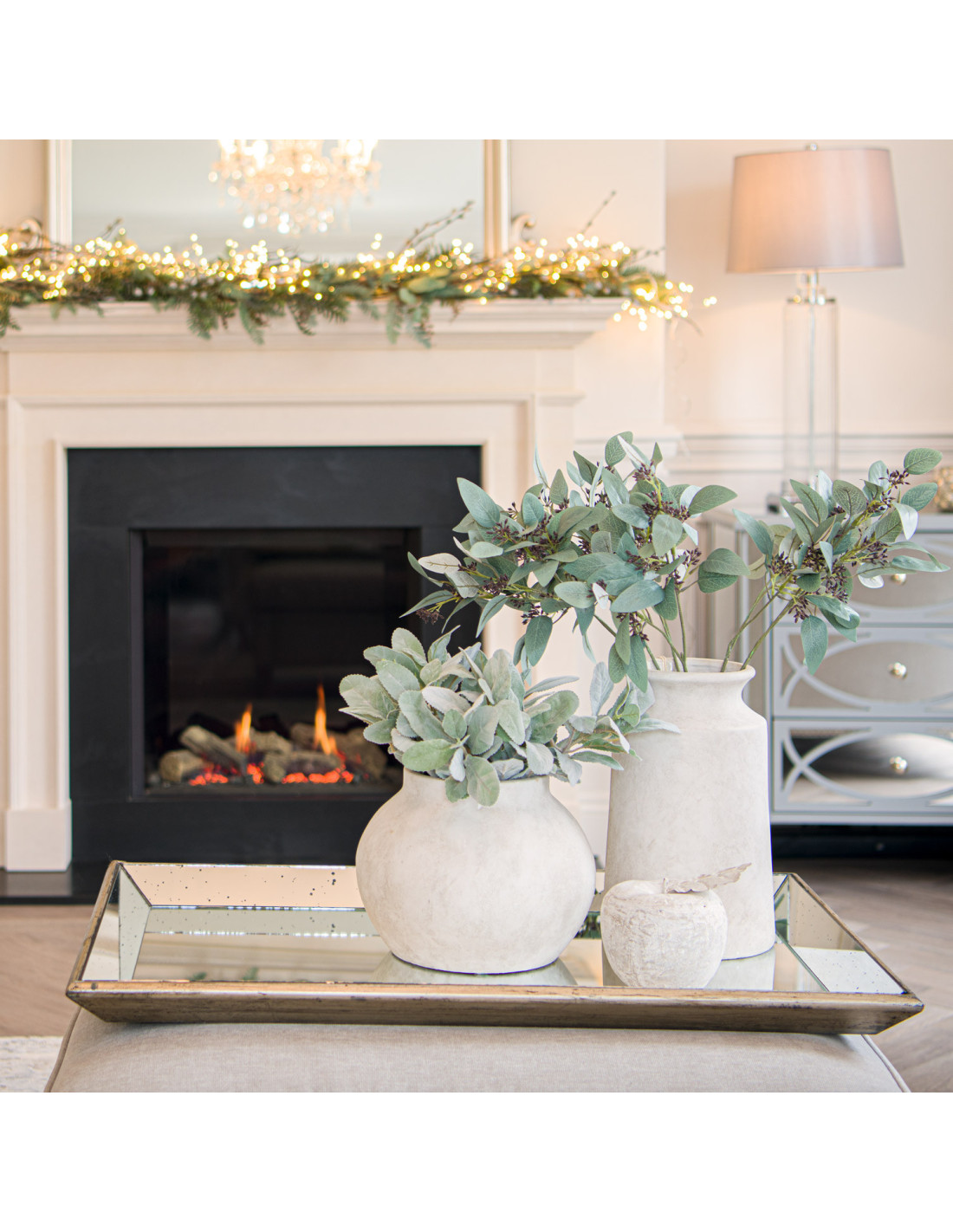 Arrange your favourite items here witness how the mirror properties elevate them. Picture it with soft LED candles for a stunning play of light dancing on the surface. Or add seasonal botanicals perhaps some Autumn White Hydrangea or Tall Eucalyptus Stem for organic texture and compelling visual drama.