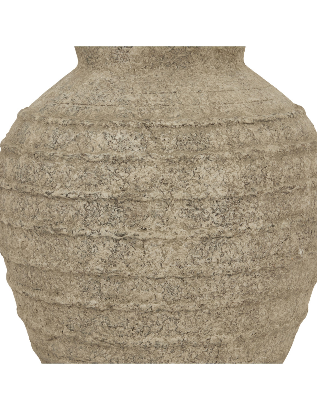 Experience its substantial presence. Crafted as an oversized vessel in a sophisticated muted grey this vase demands attention. Its balanced silhouette creates an immediate focal point making a grand statement in any living area or hallway.