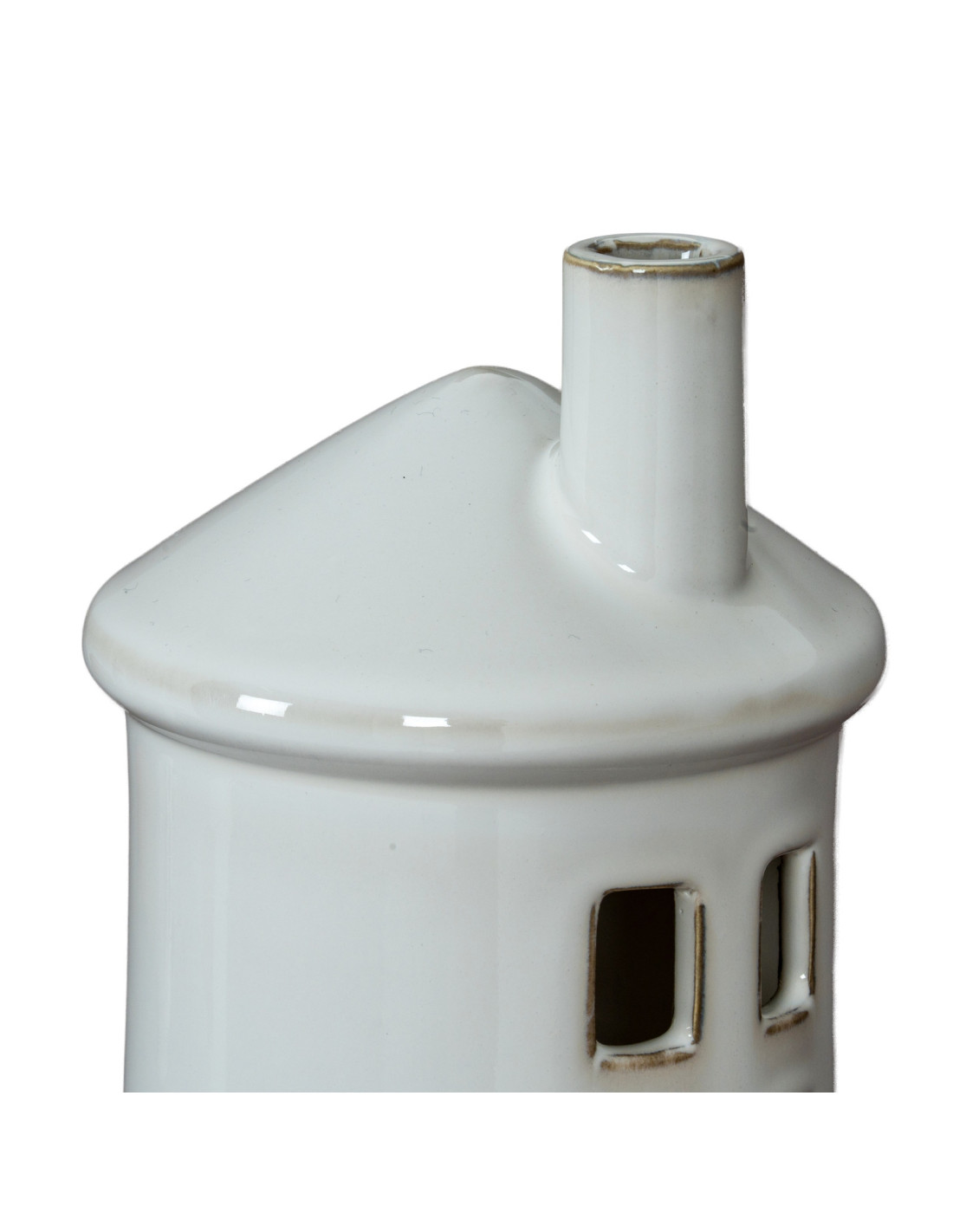 Admire its tall slender form, shaped with careful contours reminiscent of a classic lighthouse. These subtle layers create a striking depth, drawing your eye upwards from its solid base to its peak. The glazed ceramic surface offers a gentle sheen, a pleasing contrast to the thoughtfully placed cut-out windows.