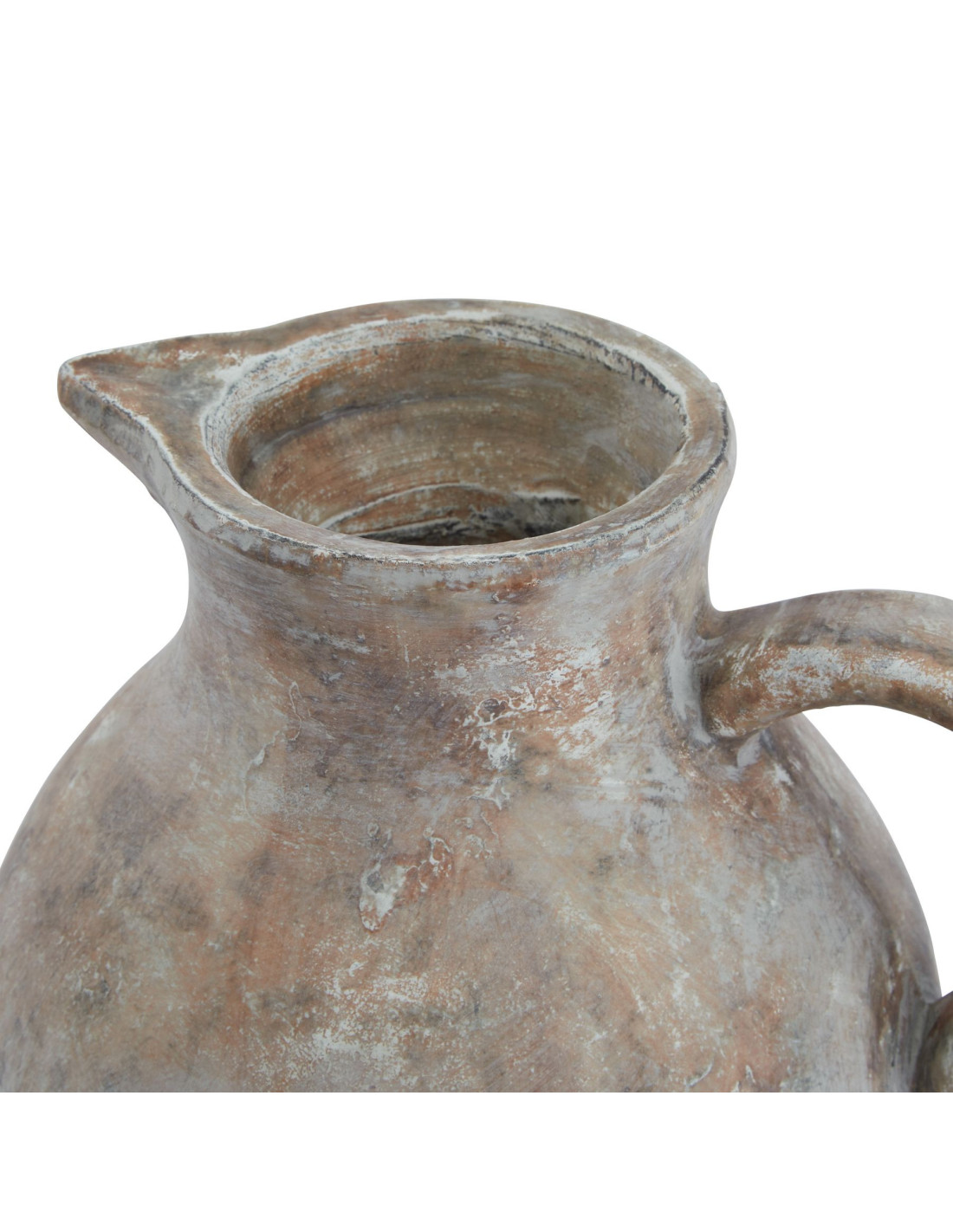 A graceful curved handle and generous pouring spout display superb attention to detail. Its substantial size offers dual appeal: a decorative statement or a functional vessel. Position it as a captivating accent in modern farmhouse interiors. Combine with dried pampas grass for a chic botanical display. Or group with other earthenware creating an inviting Tuscan vignette.