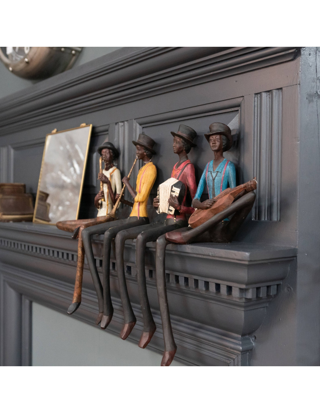 Designed ingeniously with a flat seating surface and one leg charmingly suspended this saxophonist is ready to perch. Place him effortlessly on your shelf edge mantelpiece or desk. He adds instant character a conversational piece that truly elevates your living space.