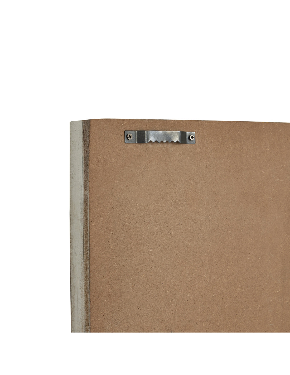 Its square frame features white washed wood. Against this light grey metal Roman numerals create a captivating contrast. The overall look is one of refined simplicity yet bold impact.
