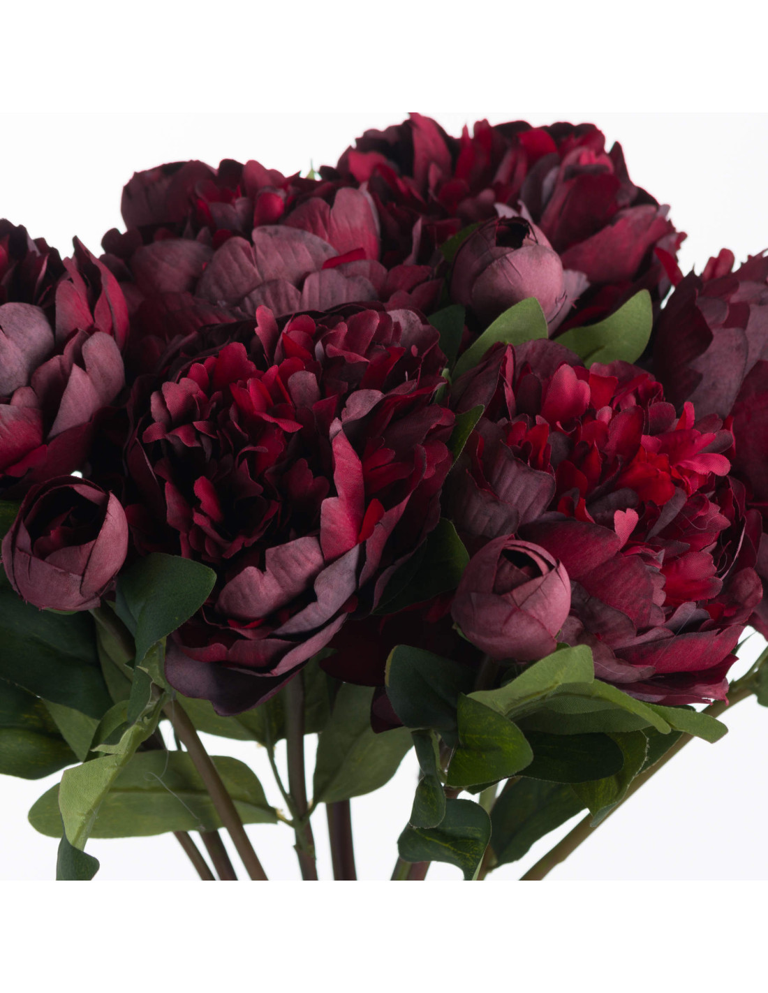 Experience the impressive realism of this long-stemmed faux peony. It features a finely detailed full bloom alongside a convincing closed bud. Observe the feathered petals displaying a rich spectrum of burgundy shades. This colour captures the natural depth found in garden grown blooms. Its appearance mirrors the elegance of freshly cut flowers without any upkeep.