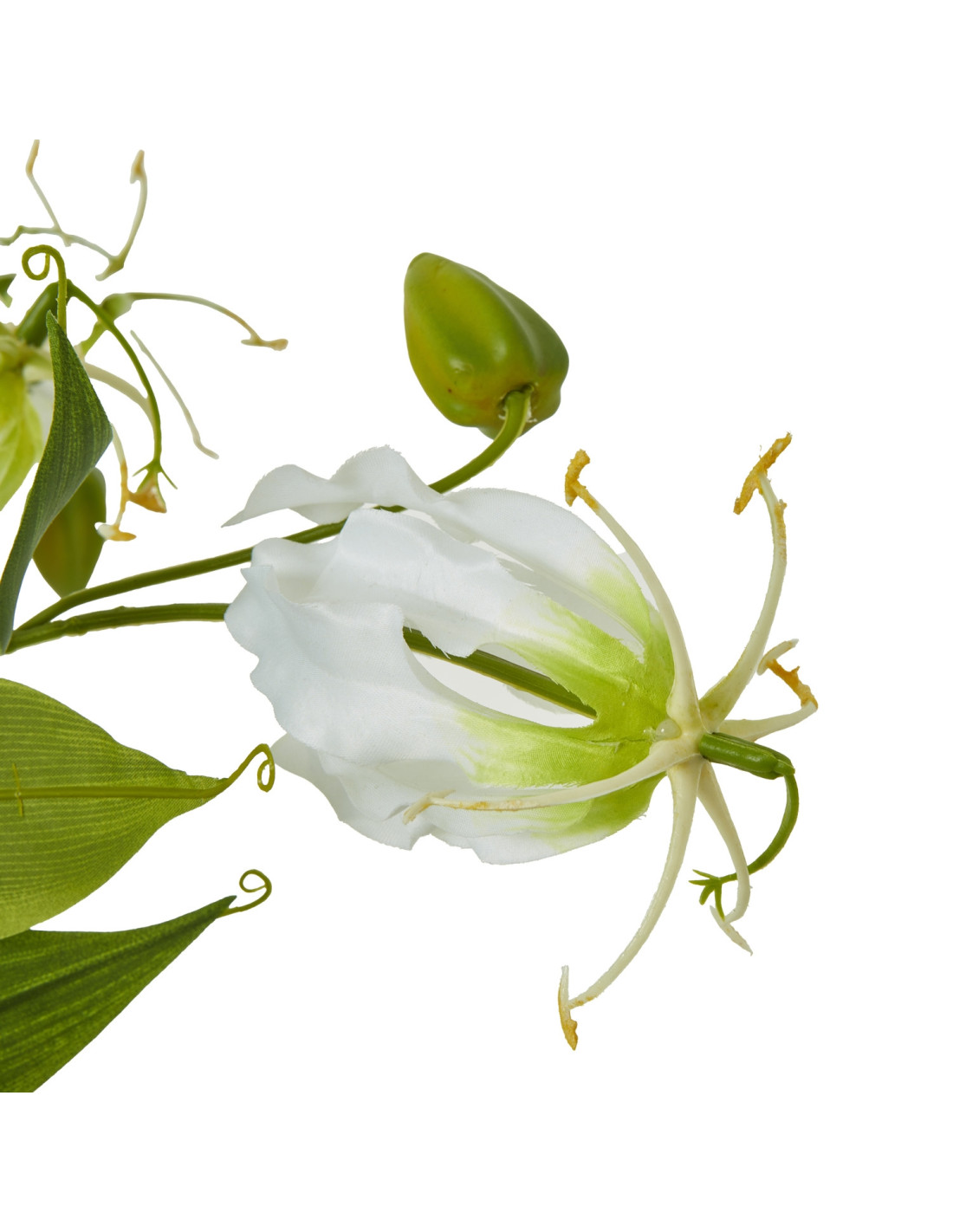 Each spray features the iconic Gloriosa Lily, also known as the Flame Lily. Its striking cream and green hues radiate a calm yet exotic charm. See those delicate, curling petals? And the lush, vibrant foliage? It all combines for a display so lifelike, you will forget it is not freshly picked.