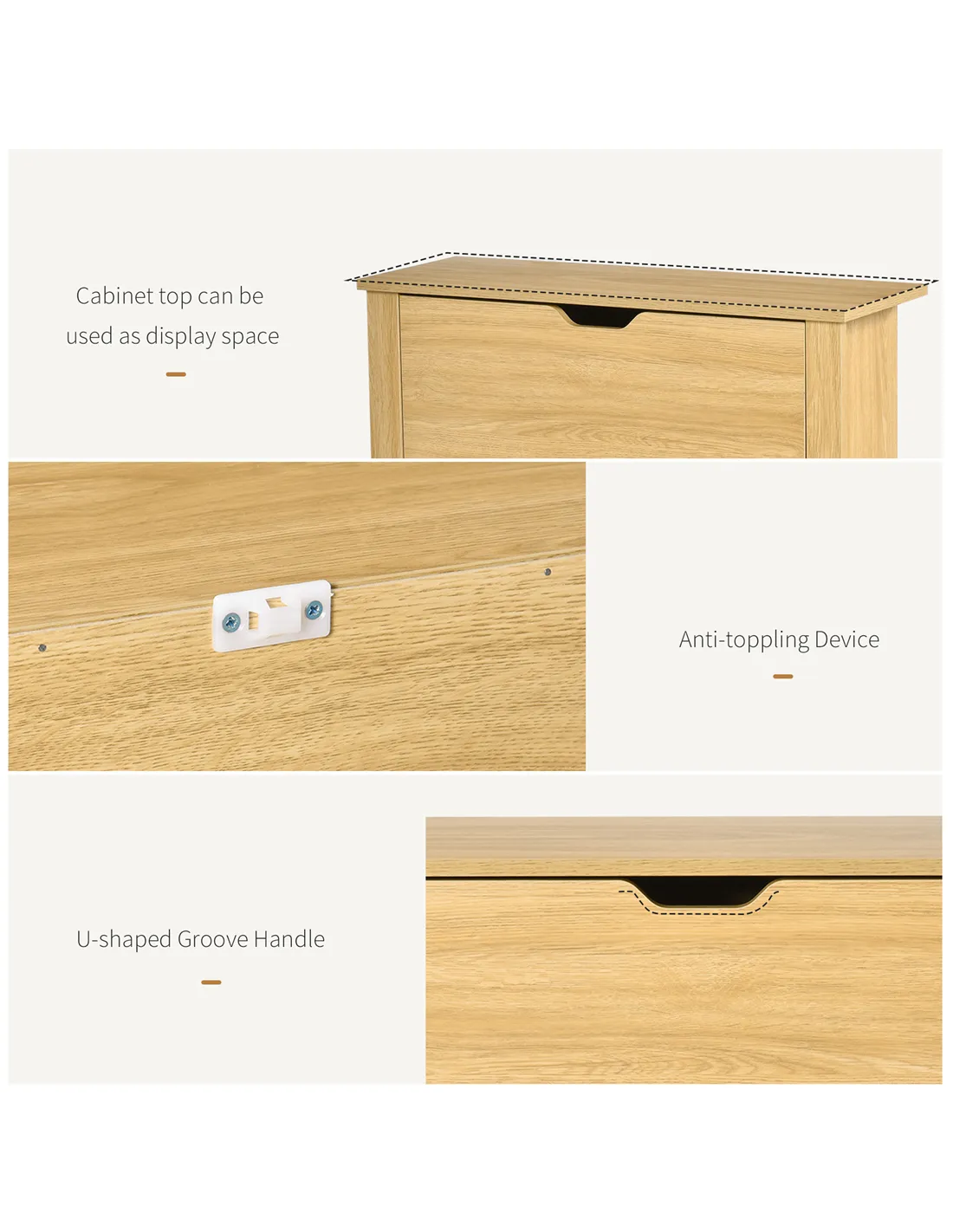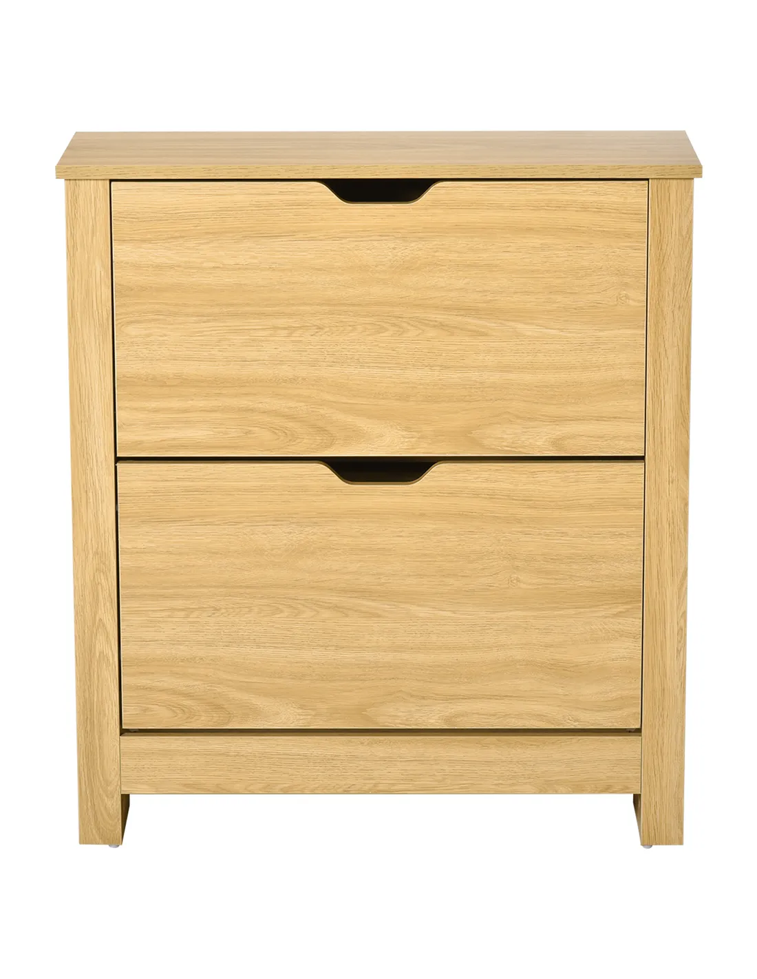 The HOMCOM narrow shoe cabinet is an ideal solution for maximising storage in compact areas such as hallways, entranceways, or living rooms. Its slim profile fits neatly into tight spaces, helping to keep footwear organised and out of sight. The two flip drawers with adjustable shelves accommodate between 6 and 12 pairs of shoes, making it perfect for families or individuals with a moderate shoe collection. The natural wood finish complements a variety of interior styles, from modern minimalist to cosy traditional homes. Use the flat top surface to display decorative items, keys, or mail, enhancing both functionality and style in your living space. Anti-tipping straps ensure safety when placed in busy households or homes with children.