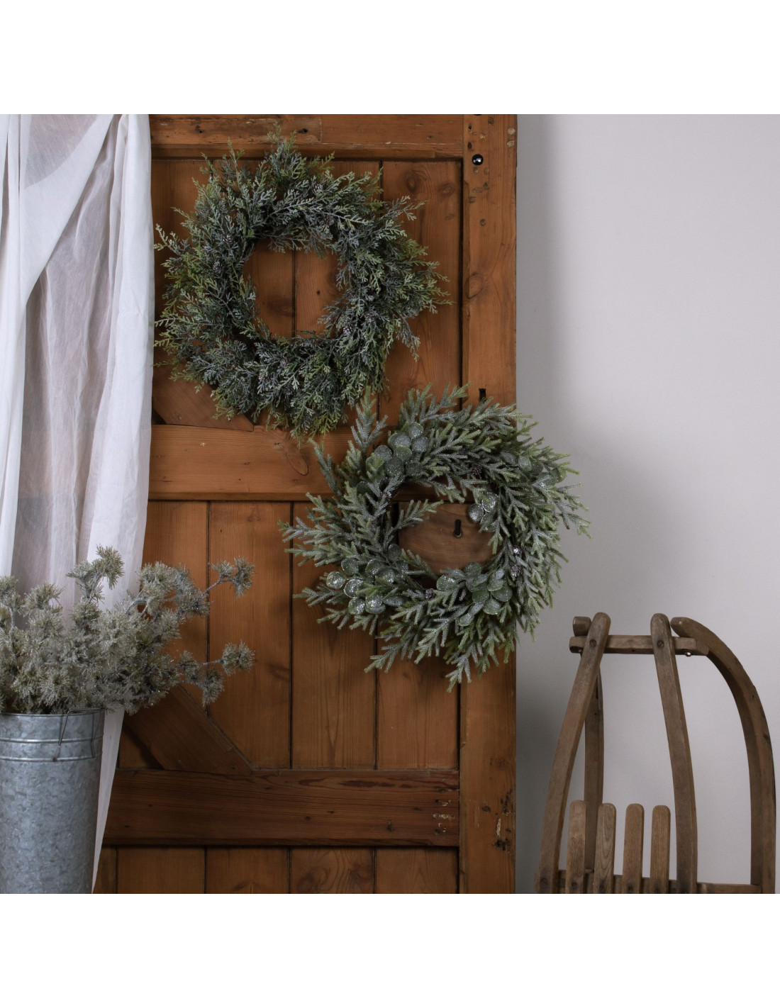 Transform your space with the breathtaking beauty of a crisp winter scene. Our Frosted Pine Wreath captures the delicate artistry of ice-kissed needles, each branch appearing naturally dusted with a gentle morning frost. Thoughtfully placed pinecones add a wonderful organic texture, bringing rich dimensional interest to the design.
