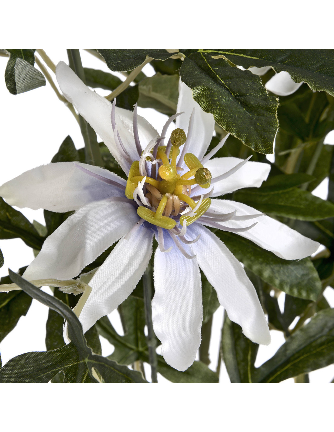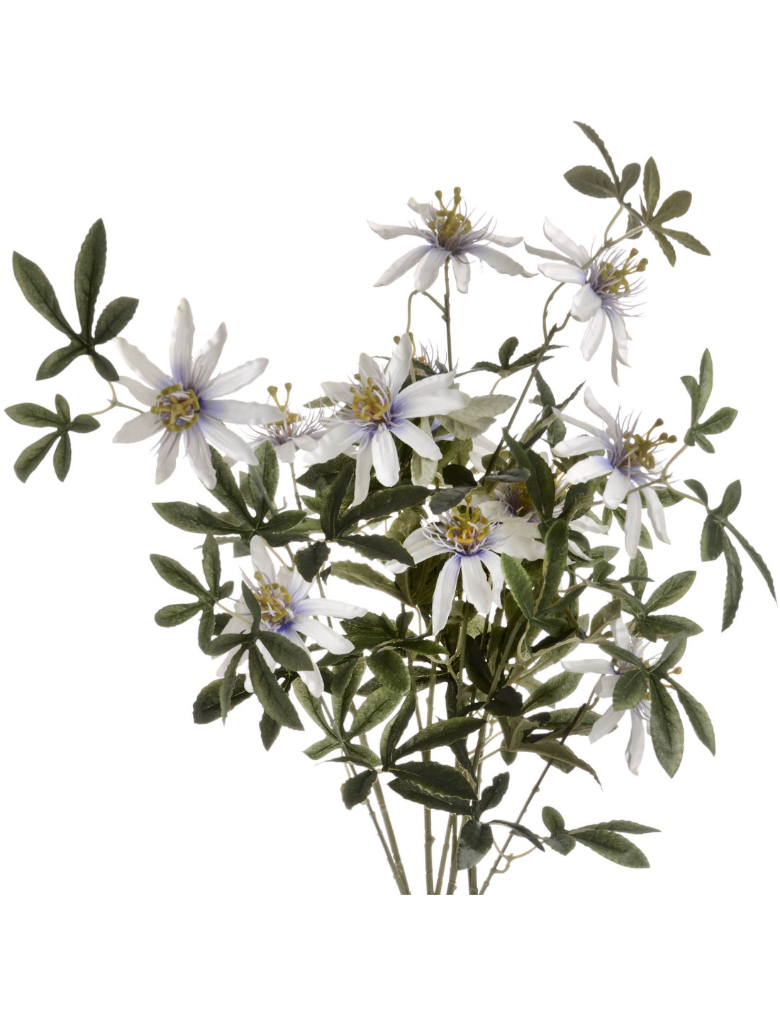 Bring the stunning allure of the Passiflora incarnata into your home with our exquisite artificial spray. No green thumb needed for this beauty. Each 80cm stem is a masterpiece. Observe the flowers iconic corona of delicate filaments, framed by pristine white petals and vibrant green foliage. It is a true visual treat.