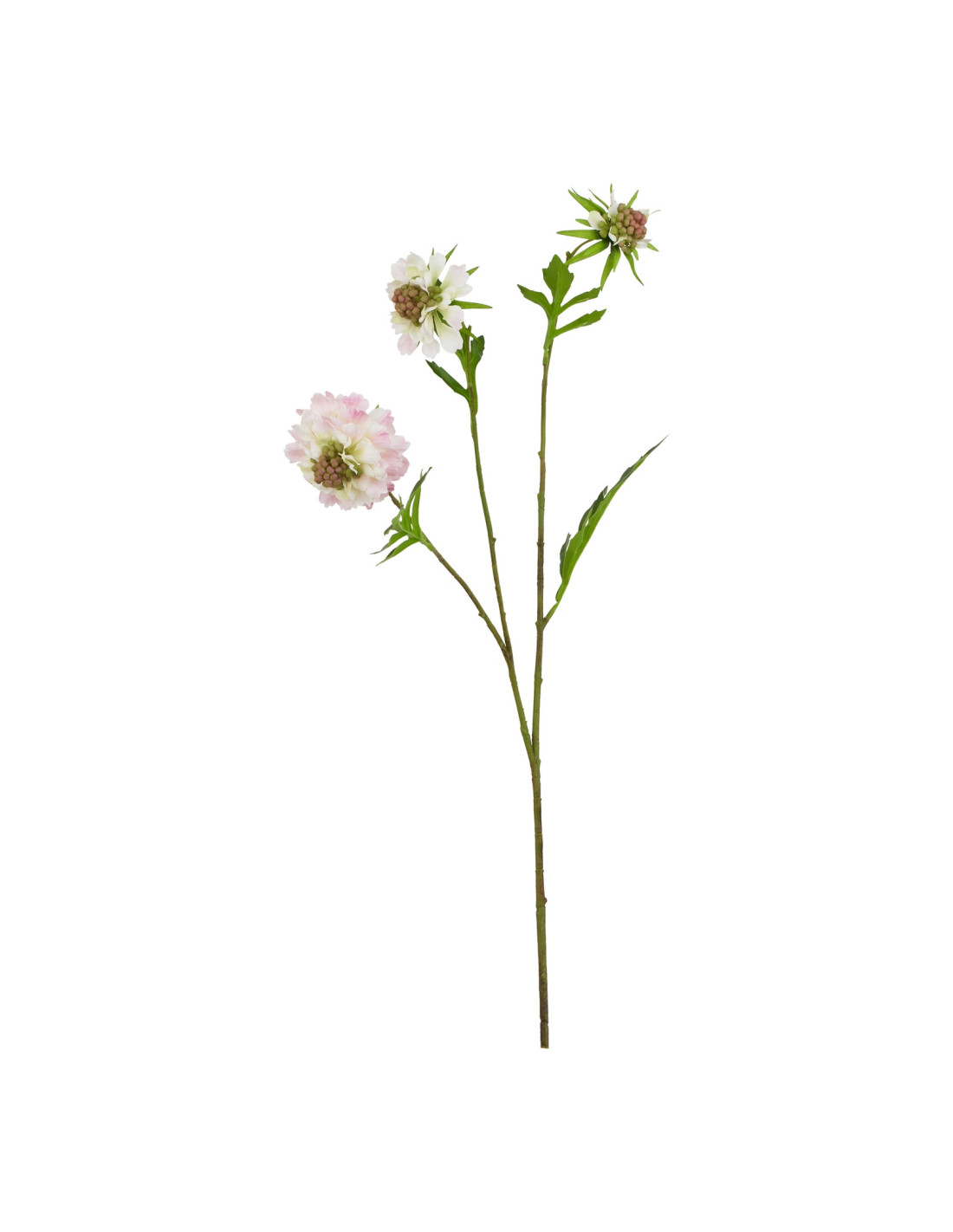 The detailed scabious bloom rests upon a vivid green stem, designed for beautiful natural-looking arrangements. It’s ideal for creating a focal point or adding a gentle flourish to your home décor. Achieve a truly harmonious scene by pairing with the complementary white scabious stems and purple sweetpea stems from our Natural Garden Collection.