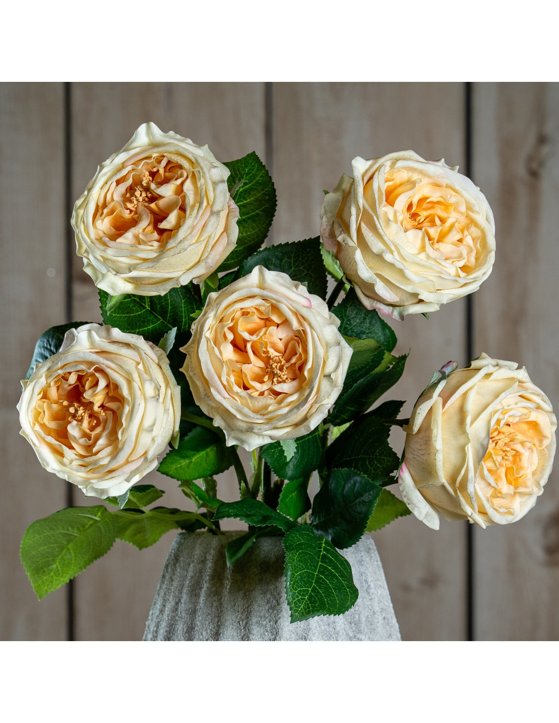 Behold delicate multi-layered petals in soft ivory kissed by a gentle blush. Each bloom boasts the authentic appearance of a natural Rosa x centifolia. Observe the authentic-looking serrated leaves enhancing its realistic appeal. This stunning faux rose offers true botanical artistry.