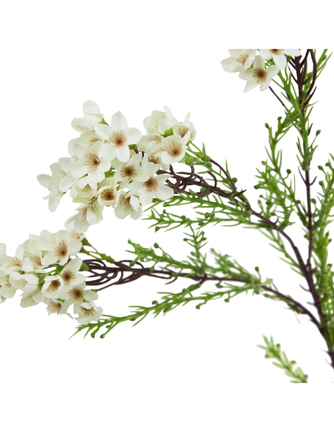 Introduce timeless elegance to your home with our stunning faux White Waxflower stem. This masterful recreation captures Australia's beloved native bloom. Observe clusters of dainty star-shaped flowers nestled among slender evergreen foliage. Its crisp white petals and fresh green leaves bring a sense of purity and renewal to any interior.